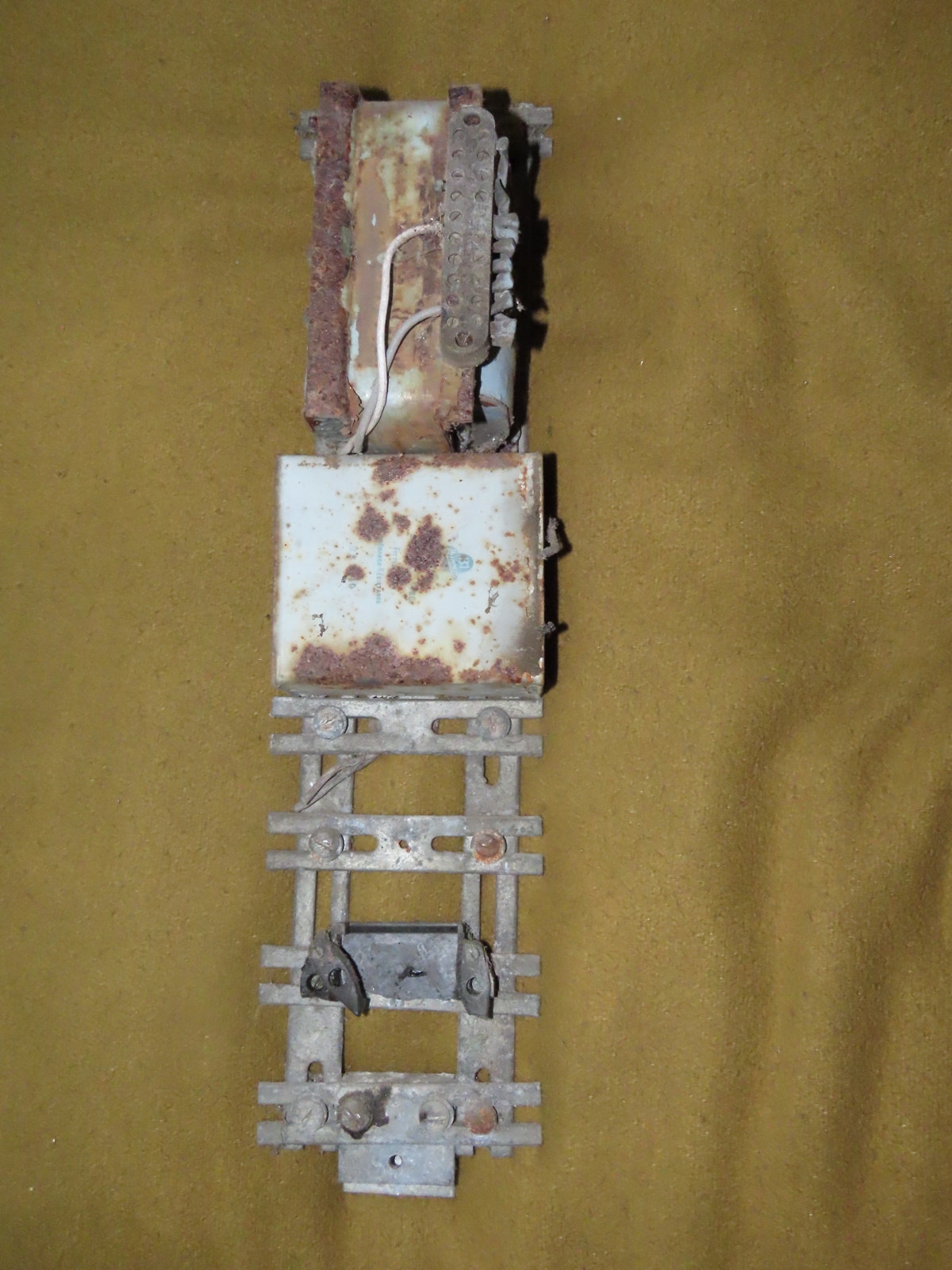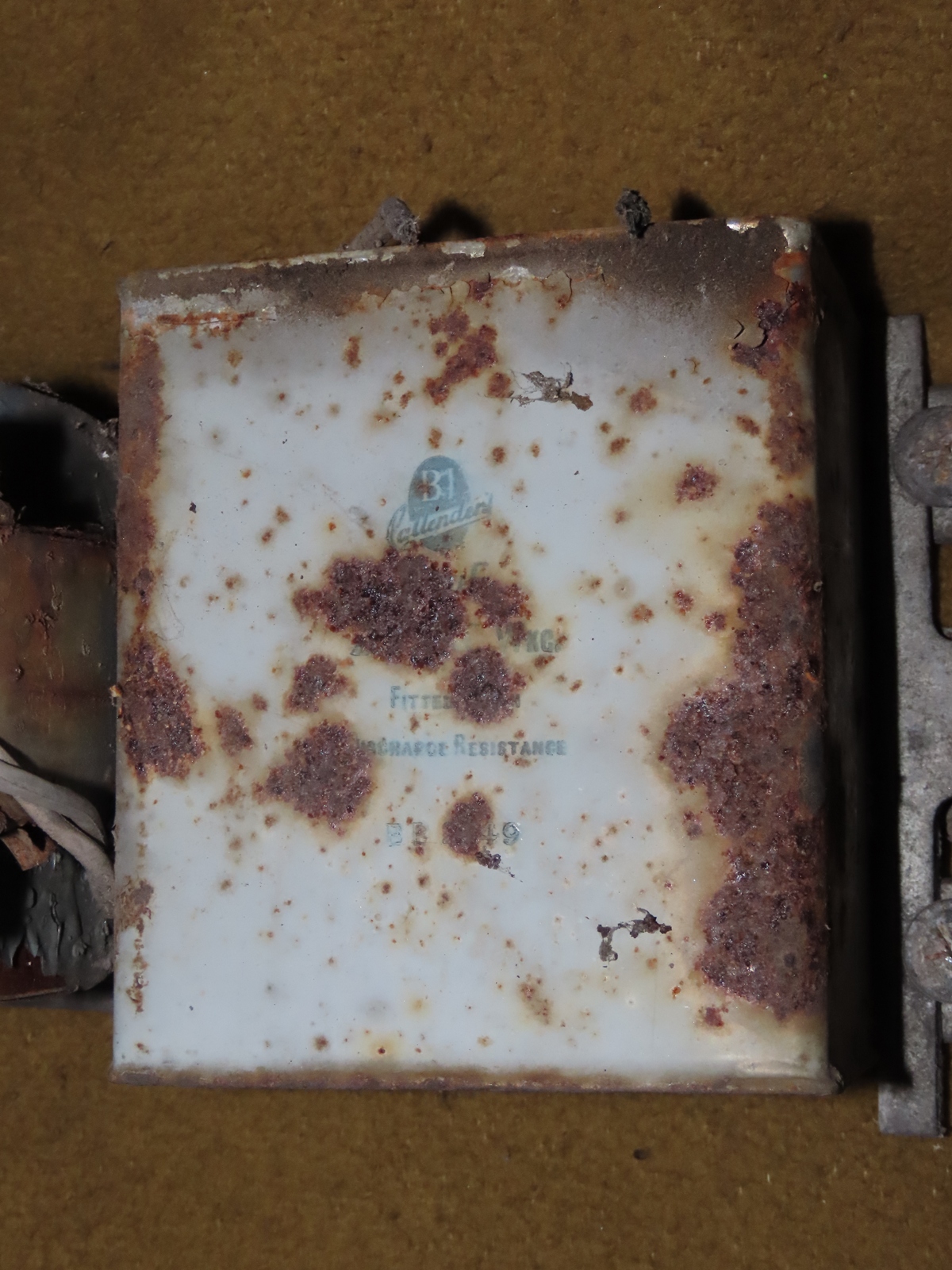 The capacitor is made by British Insulated Callender's Cables (BICC), which was formed from the merger of Callenders Cable and Construction Company and British Insulated Cables in 1945. Although rusting to the casing has prevented all of the text from being read, the year of manufacture (1949) is still visible, making my original estimated age of these installations only ten years out. The wires leading from the top of the capacitor have been cut.