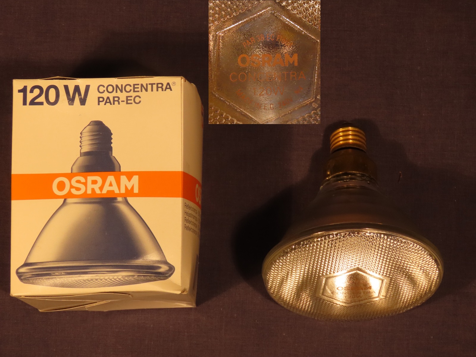 'Concentra' PAR38 reflector lamp; date code Ne1 = January 1993 (Hamilton, UK).