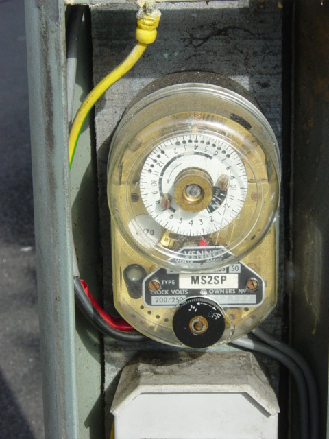 The reason that the signlight is not operating in daylight hours in these pictures (as was standard practice in Derbyshire for many years) was due to it being operated by a Venner MS2SP time switch, fitted in the base. The time switch was installed following complaints regarding the continuous burning of the signlight. However, in the signlight's latter years, the unit again remained lit constantly - perhaps due to the time switch developing a fault.