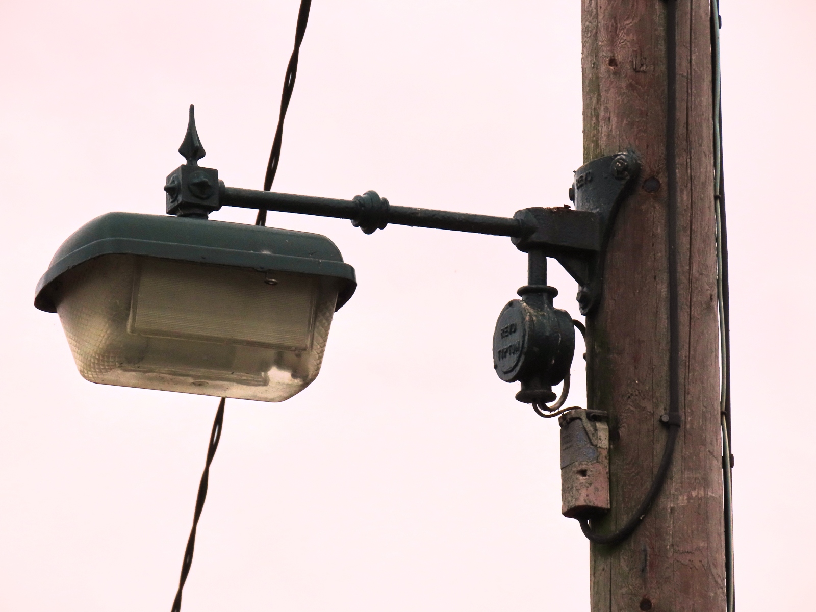 The small circular box bearing the Revo Tipton name would have served as the original fuse box for this bracket; this has since been superseded by a modern Henley cut-out positioned below. Around the side of the pole is a NEMA photocell bracket with a Zodion SS9-DLS part-night photocell fitted.