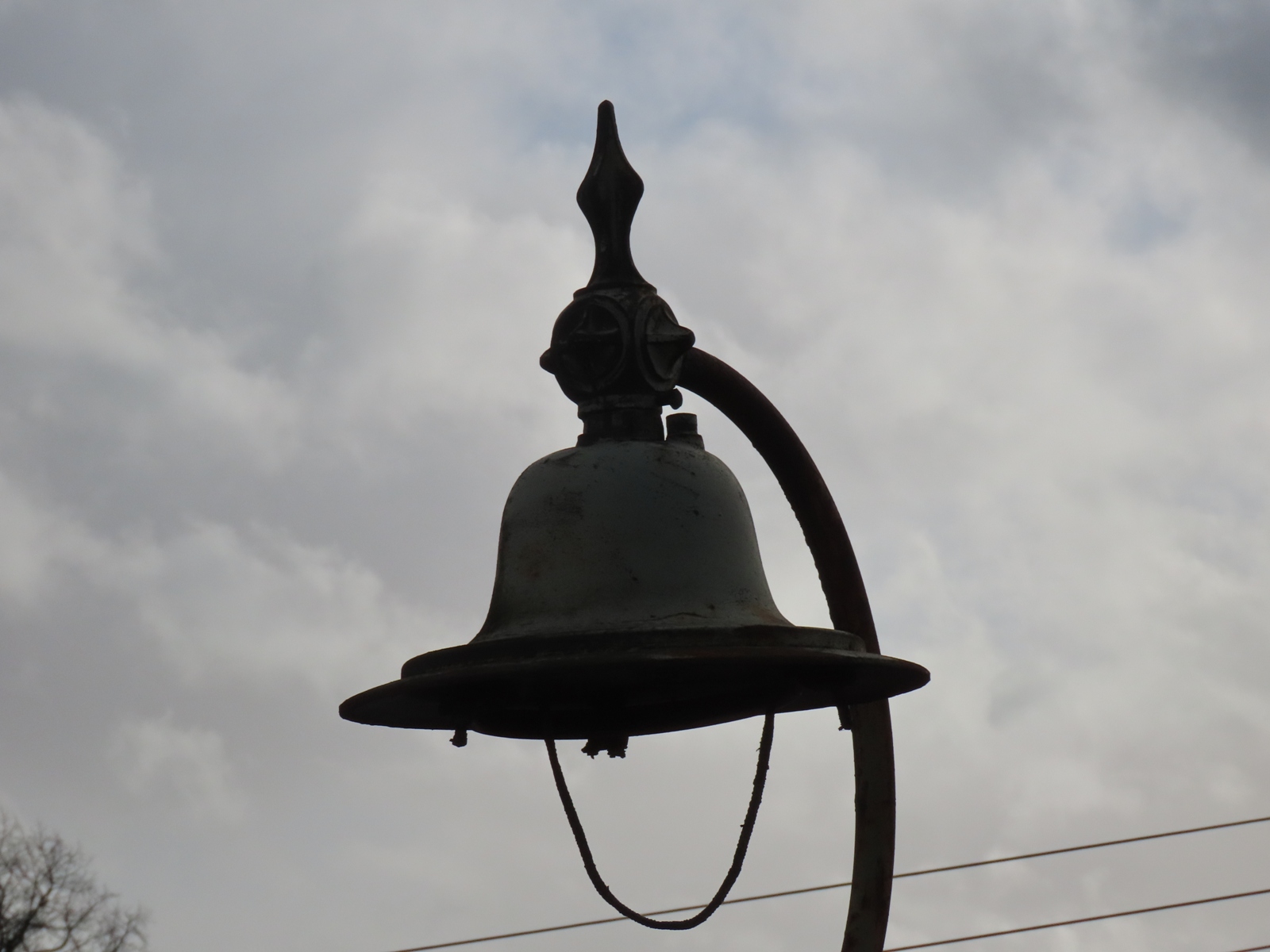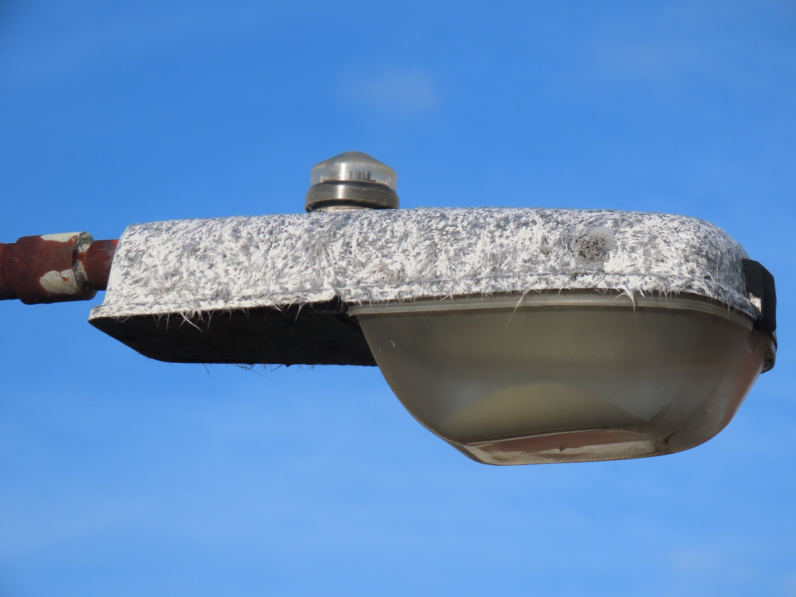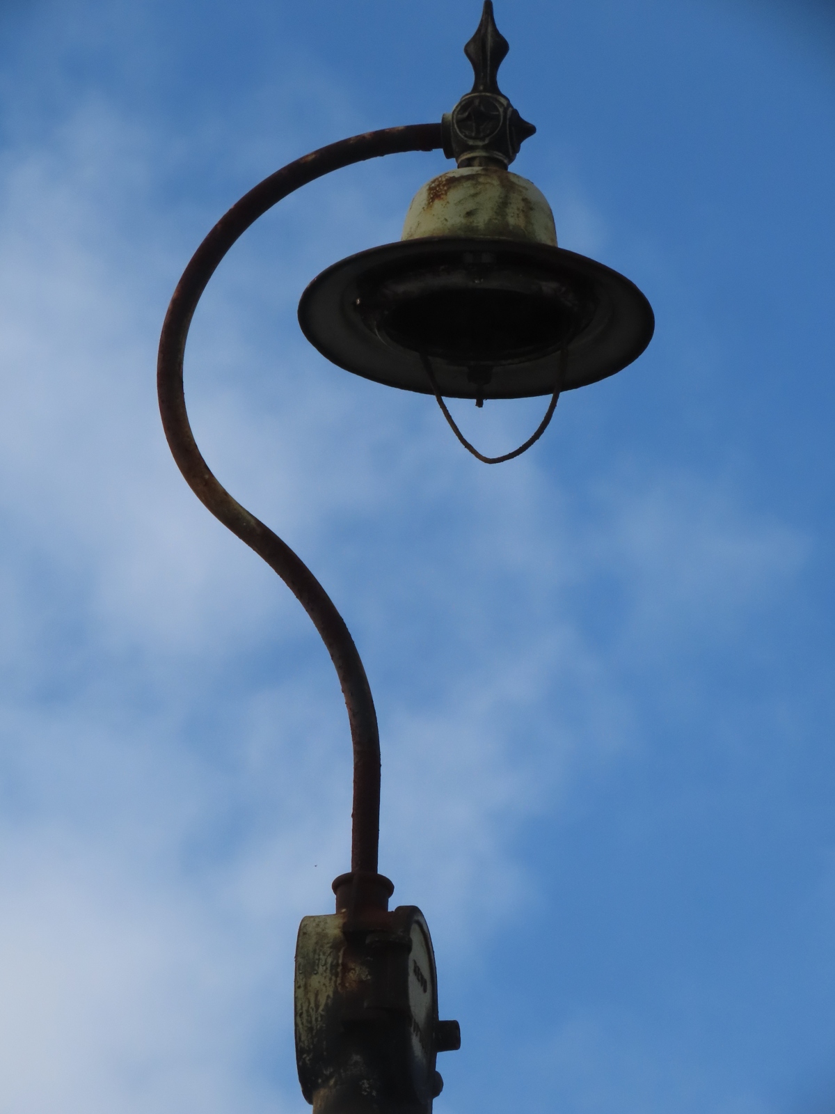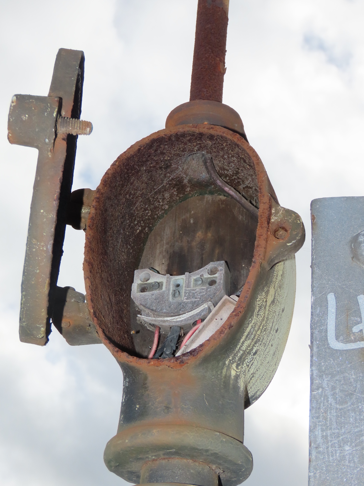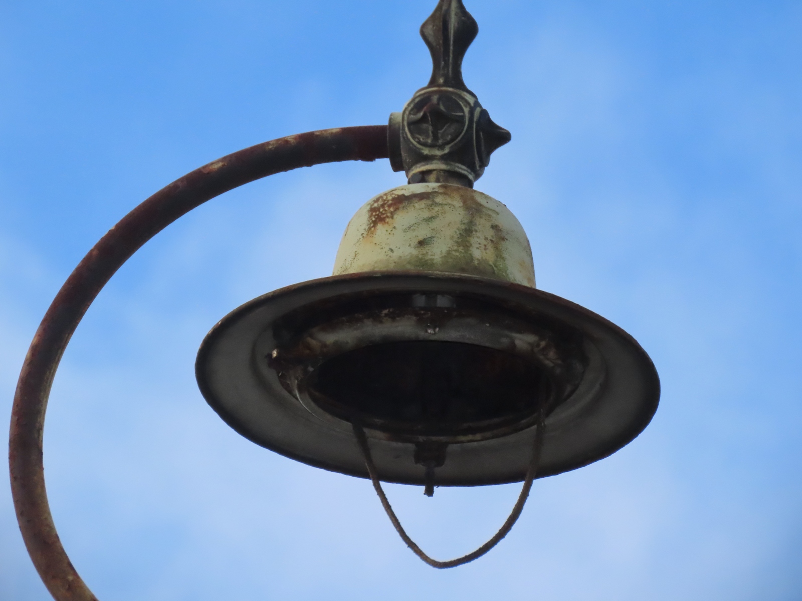 A length of asbestos wiring hangs out of the open lantern - its shape somewhat resembling that of the glass teardrop bowl that would once have existed.