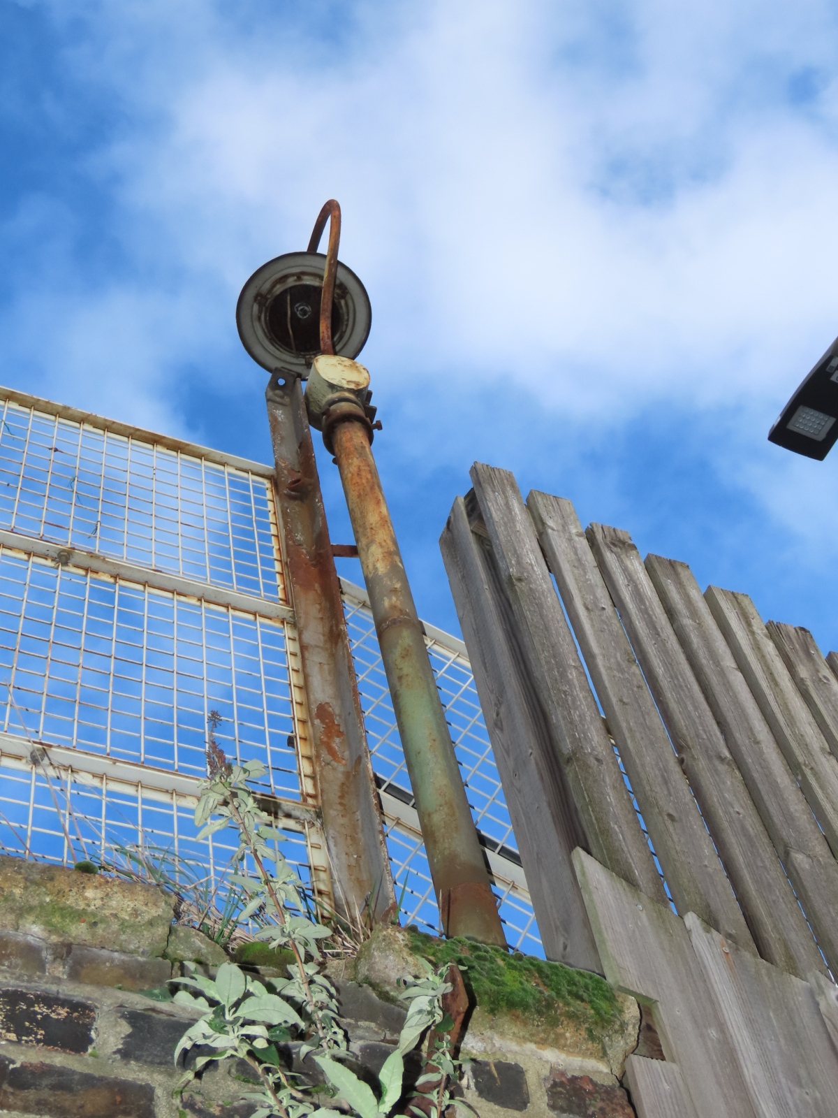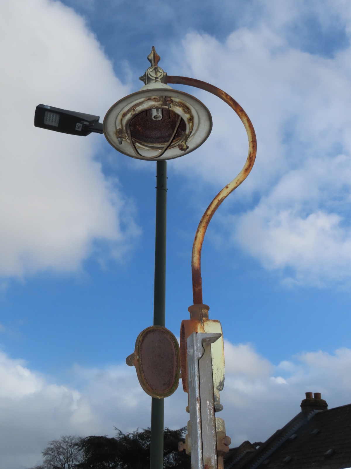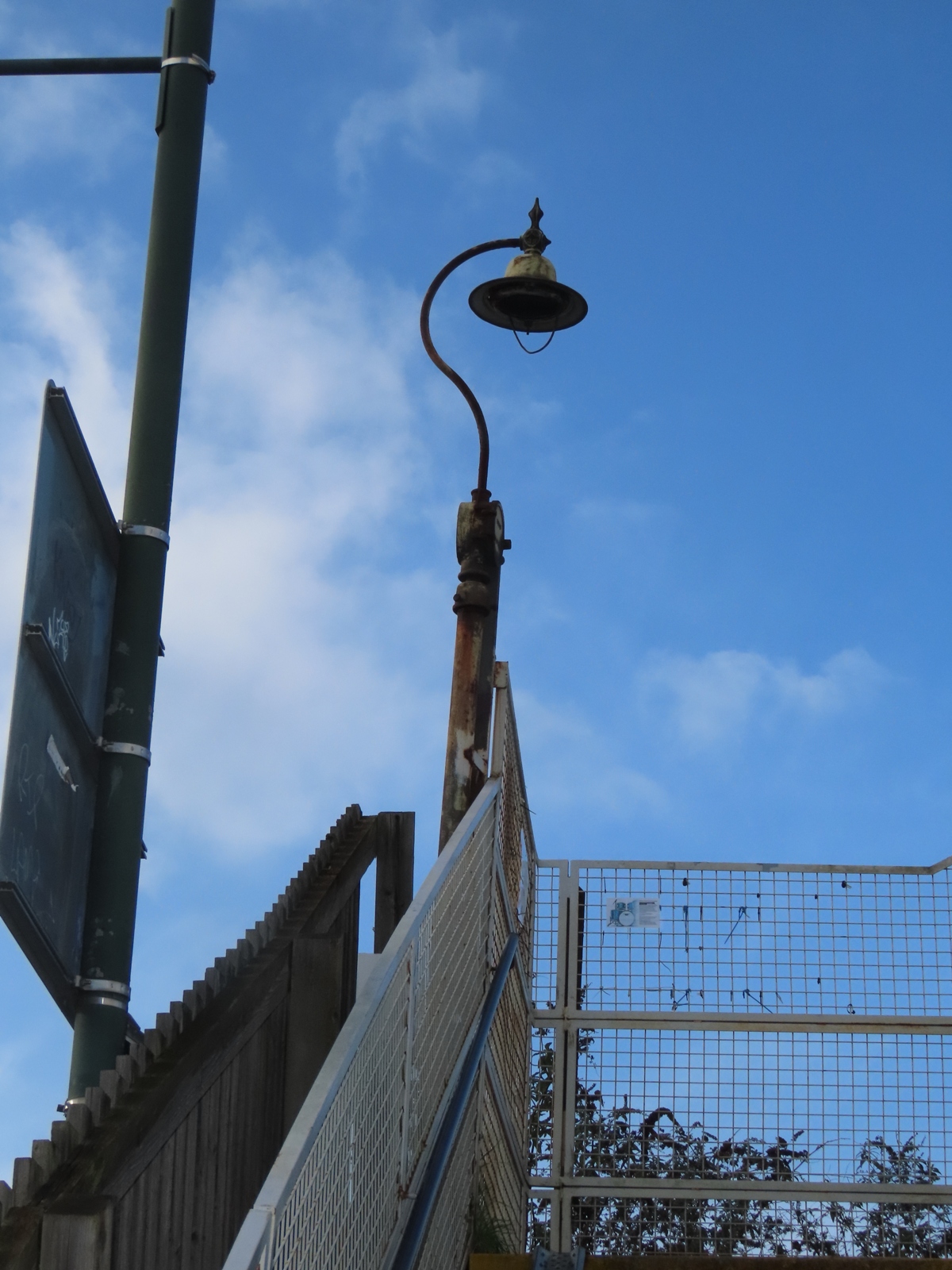 Off South Worple Way, Mortlake, London Borough of Richmond-upon-Thames With thanks to 'Jo' for informing me of this Survivor. Attached to a pedestrian footbridge that passes over the Kingston Loop railway line, allowing access to North Worple Way, is a short steel pipe that supports a Revo swan neck bracket and the remains of an unidentified top-entry lantern, which bears a slight resemblance to the Metropolitan-Vickers 'Aldwych' / Wardle 'Arran' lantern design. Judging by the installation's derelict state, it has probably not worked for many years (even in 2008, it was still in the same condition); its low height making it a potential victim of vandalism.