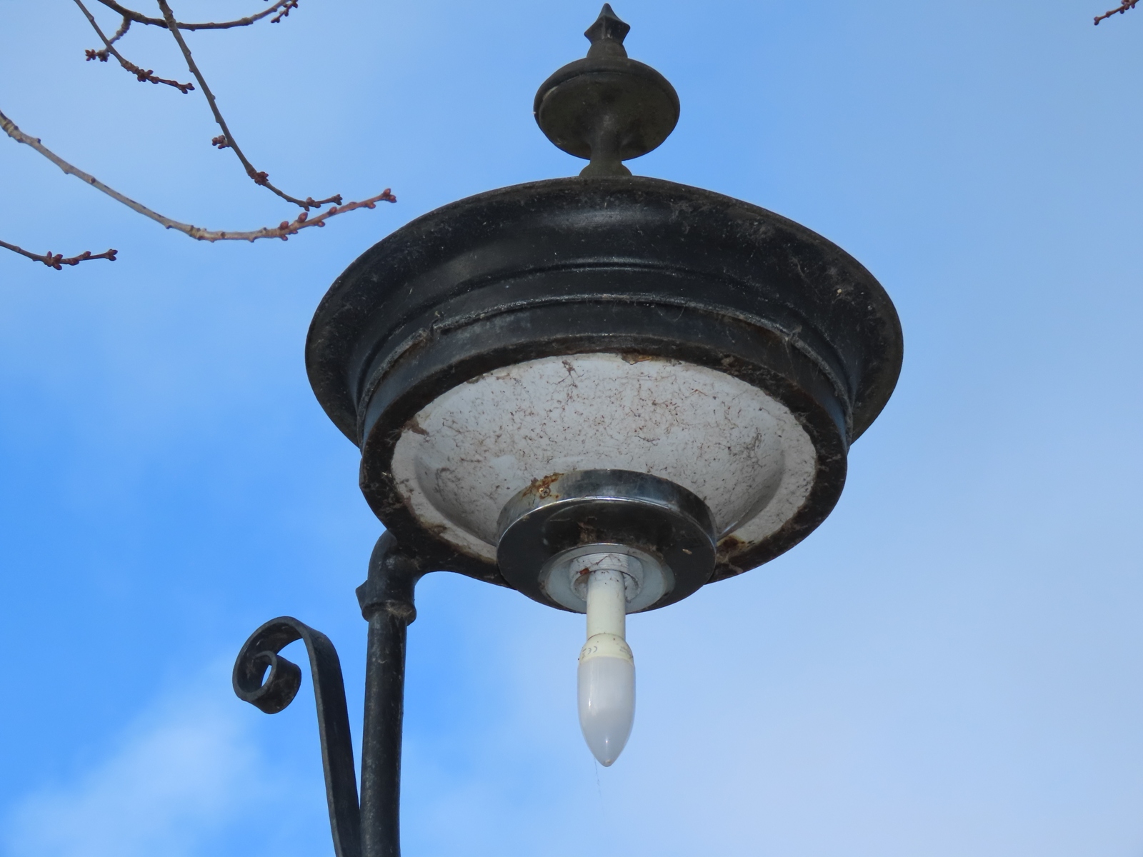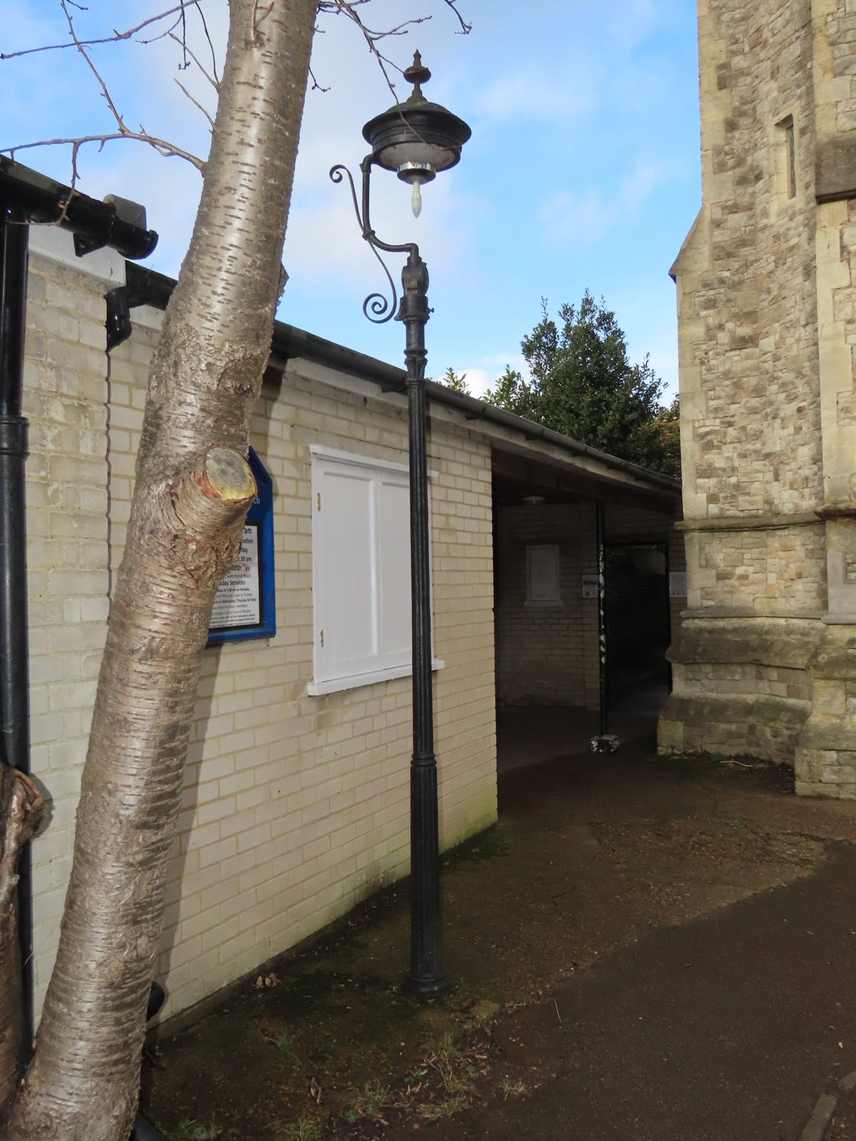 Off North Worple Way, Mortlake, London Borough of Richmond-upon-Thames Situated within the grounds of the Church of St Mary Magdalene is a 10 ft (3·048 m) fluted cast iron column with (possibly) later swan neck bracket and integrated side-entry lantern of unknown manufacturer. The lantern may have begun life as a gas lantern before being converted to electricity later, according to the Parish Priest who chatted to me after I had taken these photographs. For additional pictures of the church itself, along with the famous mausoleum housing the remains of explorer Sir Richard Burton and his wife, please click here.