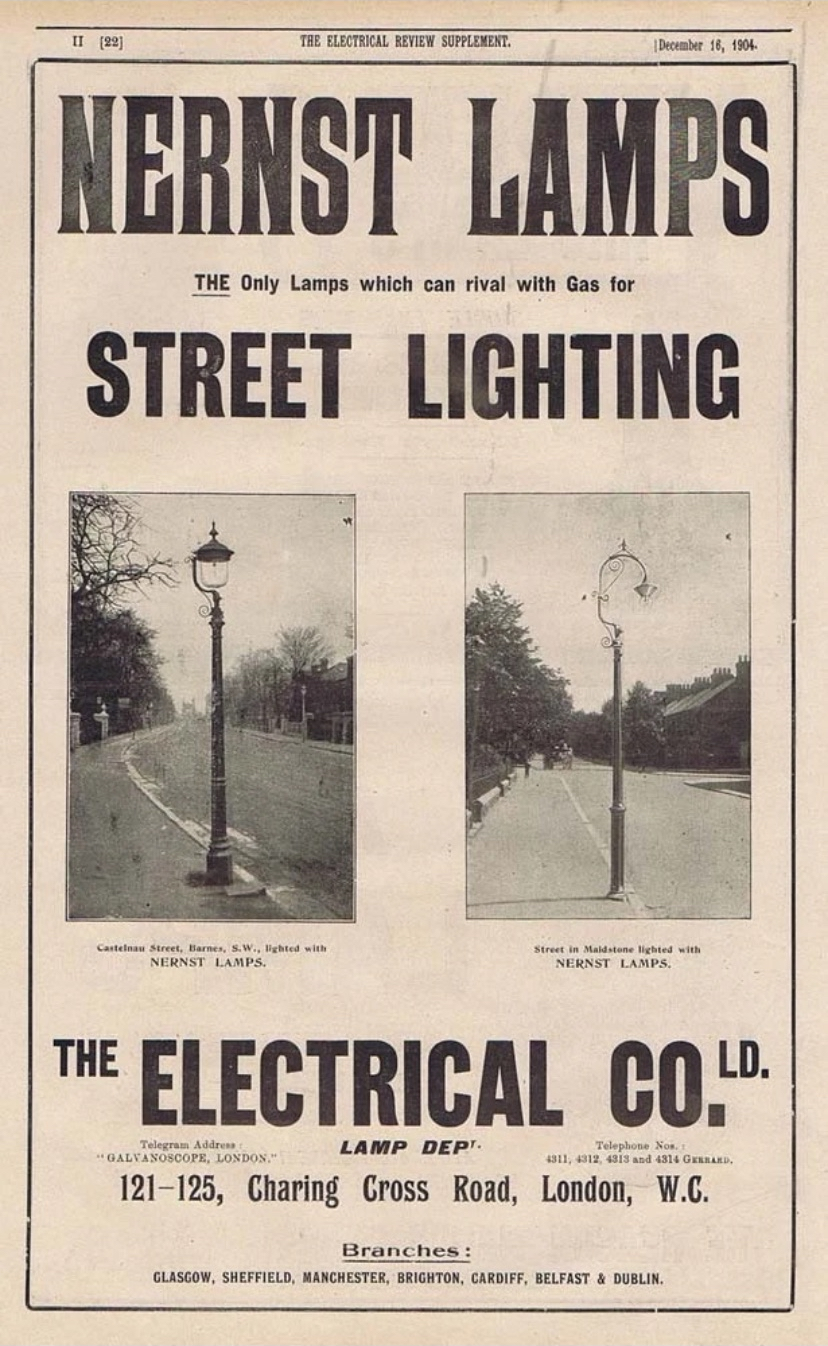 Fellow collector LeoLampposts discovered this scanned image online of a page from the Electrical Review Supplement dated the 16th December 1904, showing an identical lantern (but fitted with a bowl) on Castlenau Street in Barnes (possibly used in conjunction with the columns seen on page 12B) that ran a Nernst lamp - these were a revolutionary form of incandescent lighting developed at the end of the 19th century that utilised a ceramic "glower" rather than a metallic filament. Invented by the Nobel Prize-winning German physical chemist Walther Nernst in 1897, the lamp represented a significant bridge between early carbon-filament bulbs and modern high-efficiency lighting. Unlike the Edison-style bulbs of the era, which required a vacuum to prevent the carbon filament from burning up, the Nernst lamp’s ceramic components were already oxides and could therefore operate while exposed to the open air. Additional details regarding Nernst lamps can be read below this image.