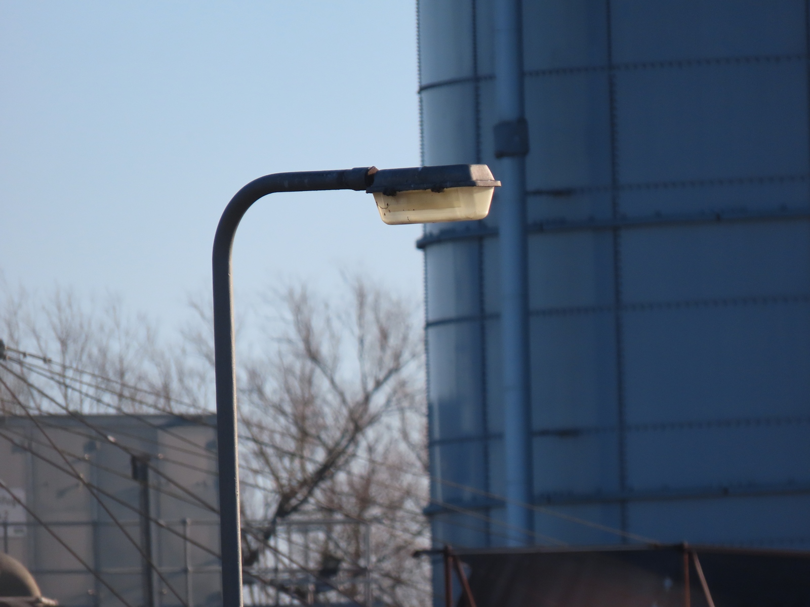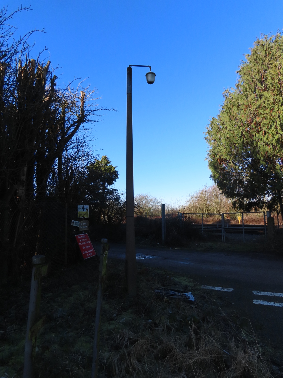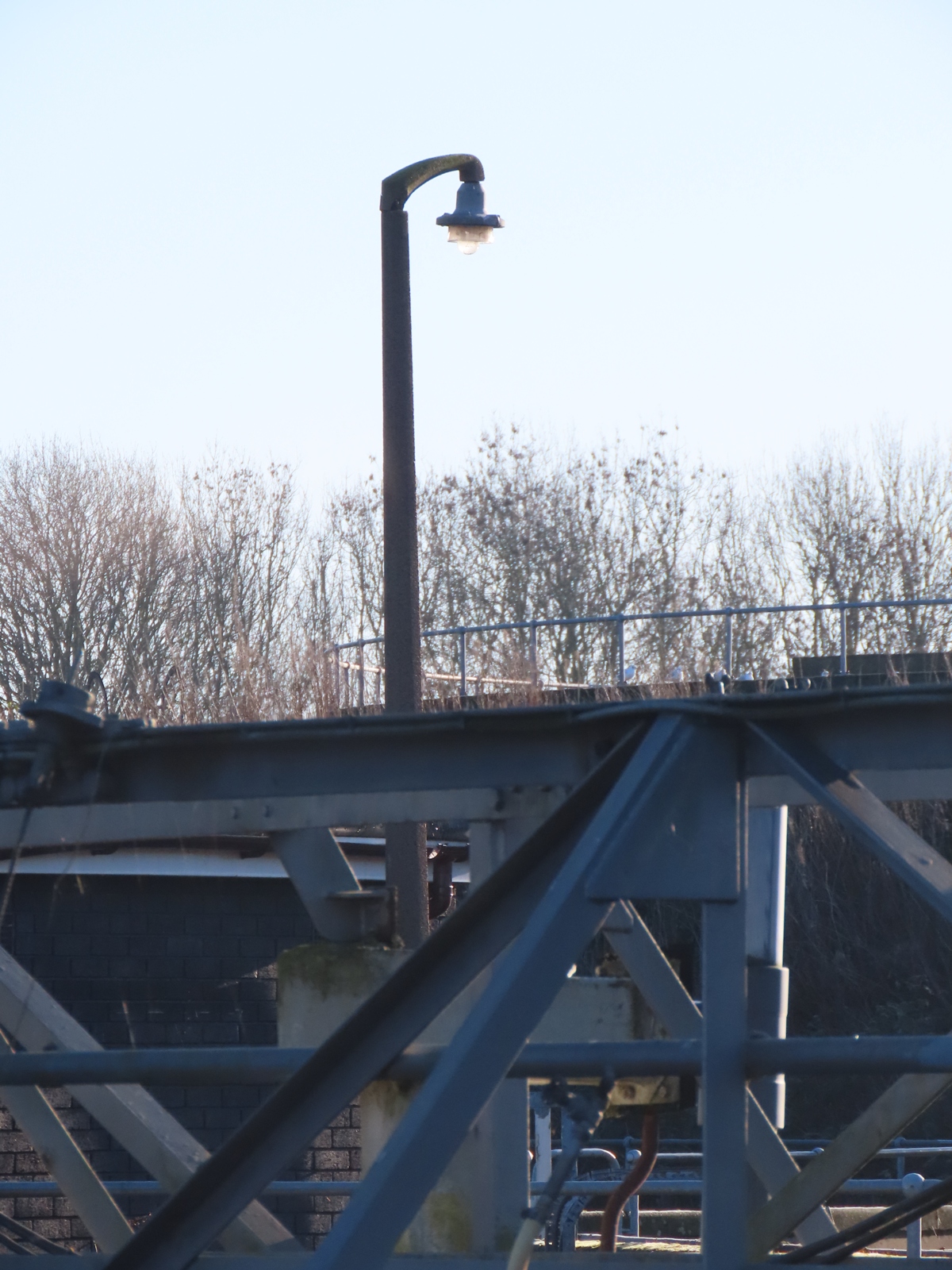 Off Meadow Lane, Stretton, Burton-upon-Trent, East Staffordshire Located within the Claymills Sewage Treatment Works are two 15 ft (5 m) Stanton 10 concrete columns, supporting single-arm, top-entry 'F'-type brackets that are fitted with ELECO HW-852 (Ware Mk.3) lanterns. Given that the two lanterns still run incandescent tungsten filament (GLS) lamps, they probably see little, if any, use these days. Two further Stanton 10 columns also exist outside the sewage works, but have been sleeved, and now run Coughtrie PW.15 bulkhead fittings instead - an unusual choice for a street lighting luminaire. When new, these columns are likely to have supported HW-852s themselves, and probably all date to around 1969, as this was the year that the modern treatment works was commissioned by the Local Authority, replacing the historical adjacent pumping station that had been in operation since the late 1880s. Additional lighting comprising Simplex Gemini (Relite A42.049) 35 Watt SOX (low pressure sodium) lanterns attached to short hockey stick columns (that themselves are attached to the metalwork above the settling tanks) was added to the sewage works in the 1970s.