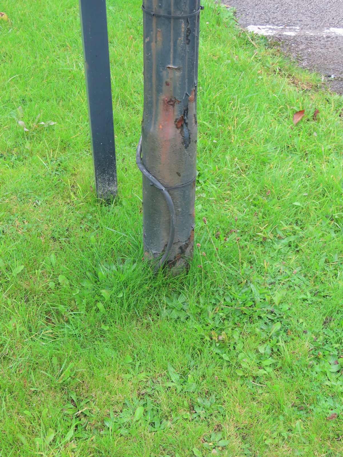 The base section of the first column is missing (or buried within the grass verge), creating an odd sense of scale. Two LED floodlights attached to the column shaft (with their supply cabling mounted externally) suggest that the HW-745 is abandoned.