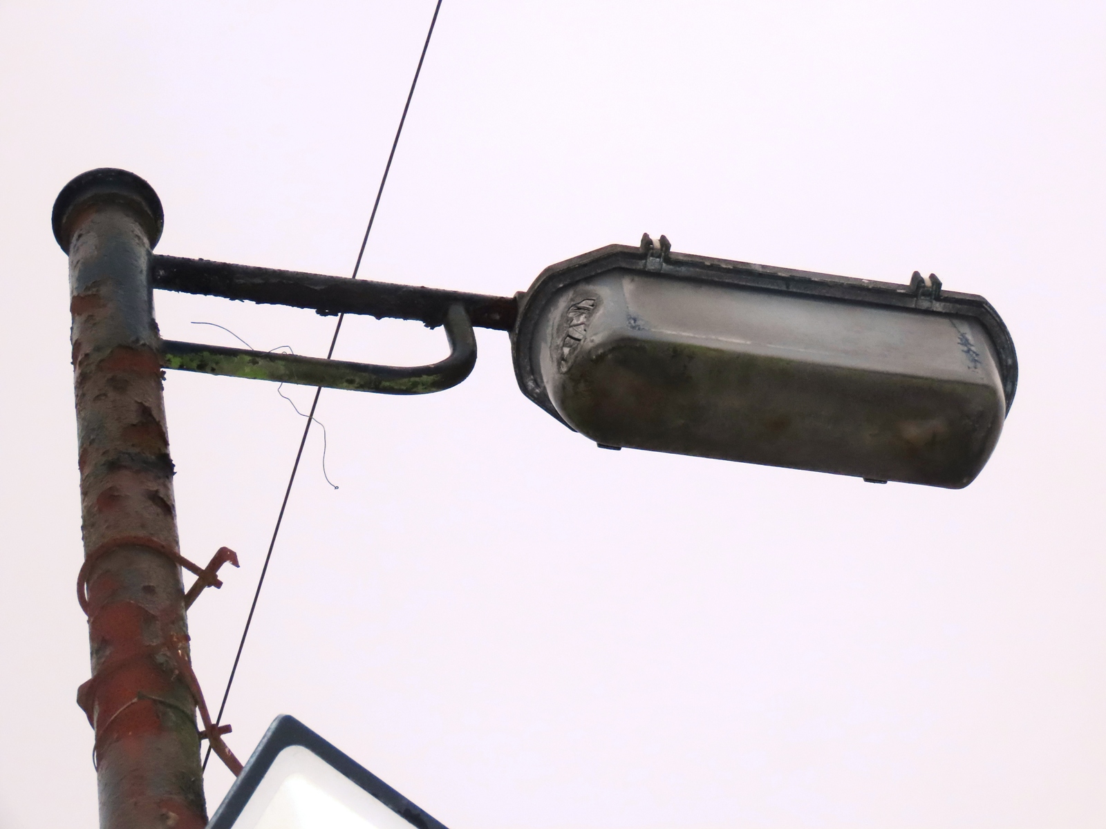 An unusual stirrup-shaped support pipe passes beneath the main bracket outreach. The column is in very poor condition, with heavy rusting visible along its length.
