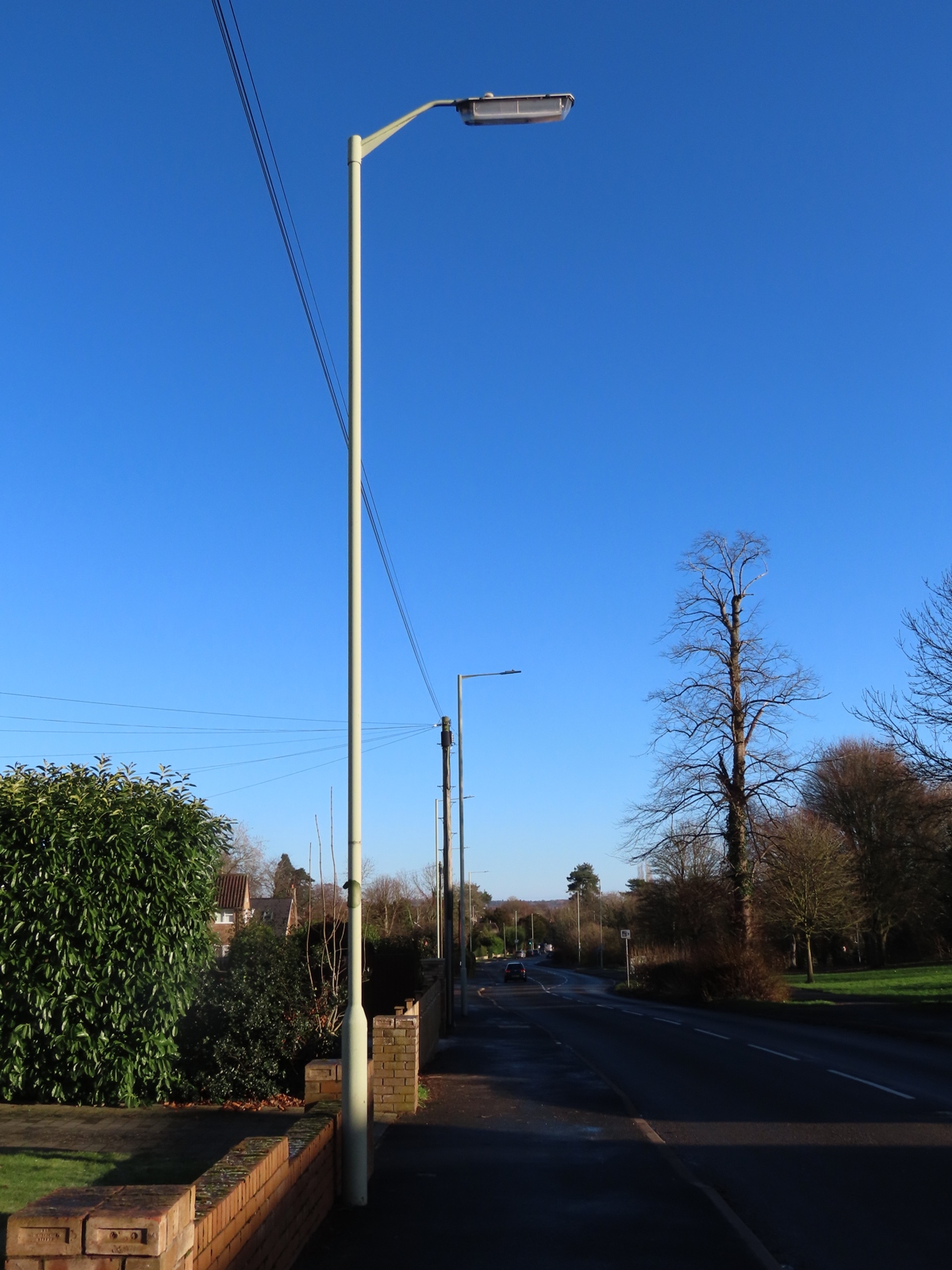 Newport Road, Castlefields, Stafford With thanks to both AgentHalogen_87 and Leo Conway for informing me of this Survivor. Located opposite Castle House Drive is a 1960s' 25 ft (8 m) Cohen Brothers' tubular steel column supporting an ELECO GR 150, named after the 150 Watt SOX (low pressure sodium) lamp that this lantern was intended to run, although this wattage evolved into the later 135 Watt lamp after only a few years of the lantern being in production. With Staffordshire favouring the SOX-E 'Economy' lamp, this example will run a 91 Watt type - and entered 2026 doing just that, despite the installation being around 60 years old by then.