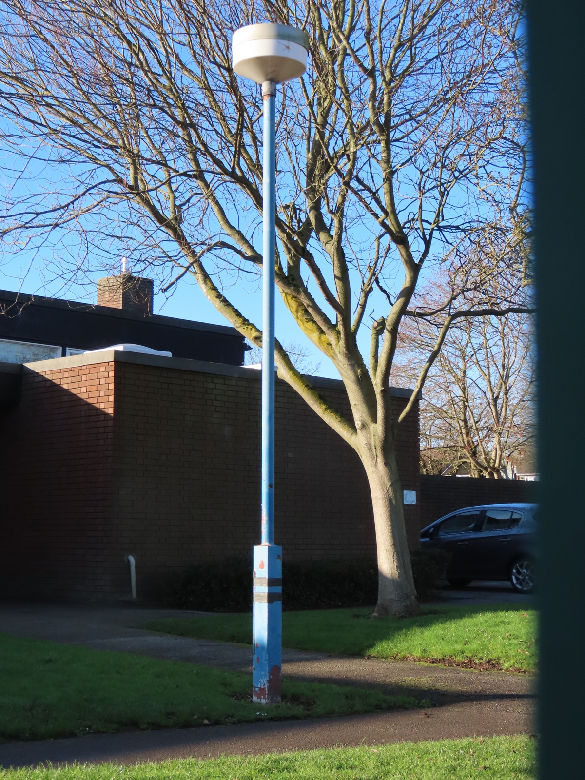 Off Riversdale Road / Carlyon Road, Atherstone, North Warwickshire With thanks to Leo Conway for informing me of these Survivors. Located at the end of Riversdale Road, at the entrance to a Royal Mail Distribution Centre, is a 25 ft (8 m) Stewarts & Lloyds tubular steel column, which, today, supports a Thorn Alpha 3 lantern, with the lamp control gear housed within it. Two further Alpha 3s, remotely-geared this time, which are unrelated to the first example, are to be seen in the grounds of a filling station on the corner of Carlyon Road and Ratcliffe Road, attached to 20 ft (6 m) Abacus base-hinged columns. In both cases, the lanterns will run a 250 - 400 Watt MBF (mercury vapour) or SON (high pressure sodium) lamp. Also nearby on Carlyon Road, inside the grounds of a school, is a 5 m tubular steel column supporting a CU Phosco P178 post-top lantern.