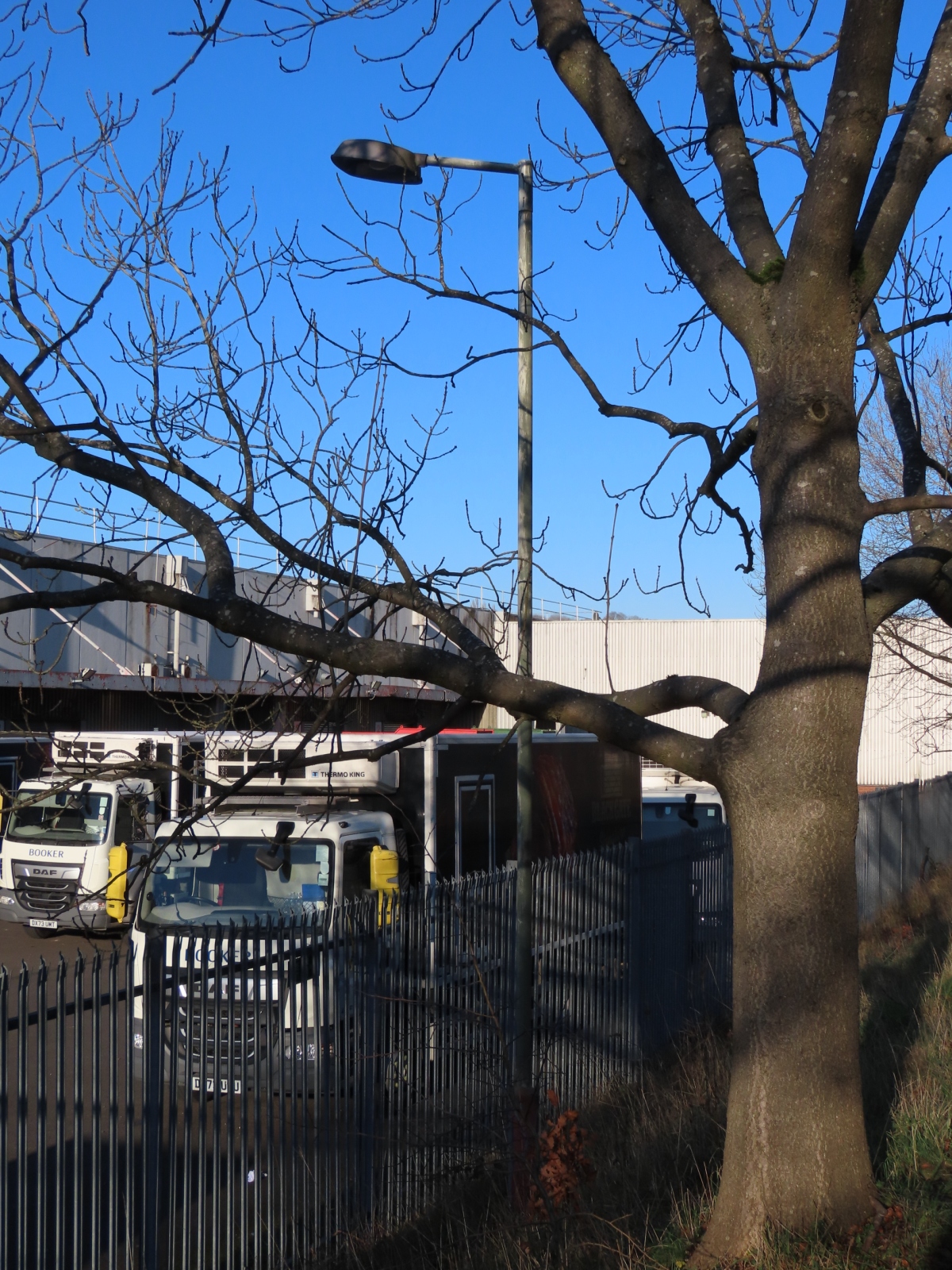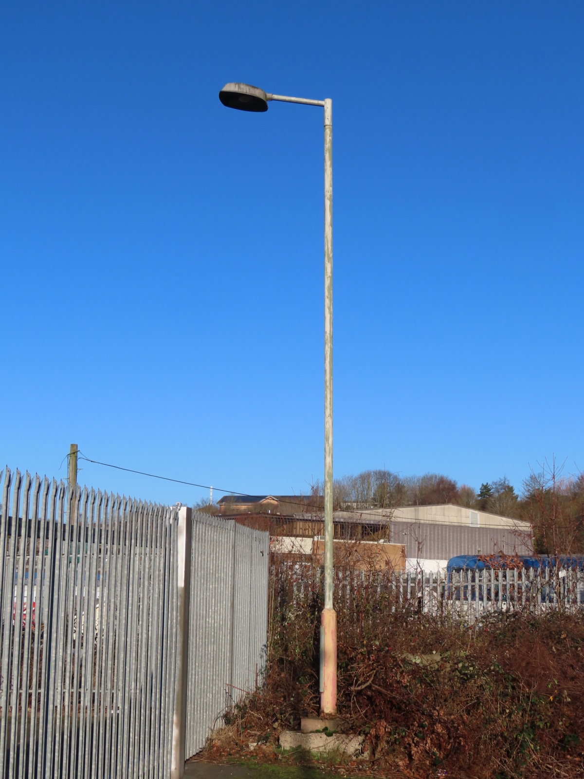 Off Amber Way, Gorsty Hill, Halesowen, Dudley, West Midlands With thanks to Leo Conway for discovering these Survivors. Installed alongside the perimeter fence for a large Cash & Carry complex are (at least) three 8 m tubular steel columns), all of which support Davis / ELECO GR304 / Silver Ray SR304 lanterns, though as all of these have lost their bowls (assuming that these were supplied originally), they now resemble the 305 (cut-off) version instead. As the Amber Way industrial estate appears to have been built in the 1980s on land occupied previously by a brickworks, the lanterns may have been sold as Davis products by then, but could still carry ELECO branding on their castings.