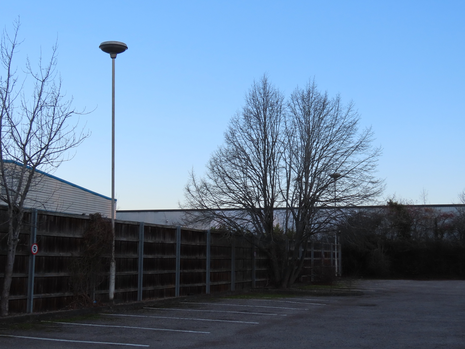 I suspect that the car park extended to the full width of the area originally, with the two columns providing area lighting throughout. A later wooden panel fence now divides the car park from the rest of the premises.