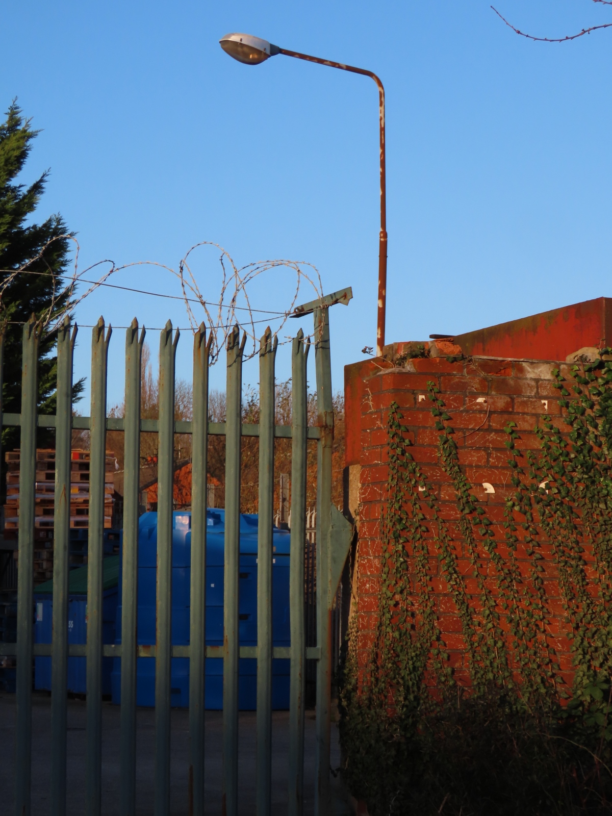 Off Arthur Street, Lakeside, Redditch, Worcestershire Located within the compound for a premises are two 25 ft (8 m) Abacus tubular steel columns, both of which support an Atlas Alpha 3 lantern, designed for running a 250 - 400 Watt MBF (mercury vapour) lamp. Although the columns are in poor condition, the lanterns themselves could still have been in operable condition when these pictures were taken in December 2025, despite newer floodlights facing into the yard from the main depot building.