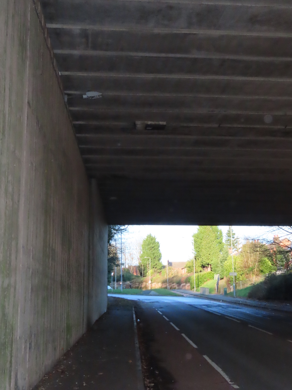 Holloway Lane, St George's, Redditch, Worcestershire With thanks to Leo Conway for discovering this Survivor. Attached to the underside of the bridge deck that supports the Alvechurch Highway is a fitting produced by the General Electric Company (GEC) for this exact type of scenario. Although its exact part code is unknown, it is believed to use much of the bodywork and bowl from the Z9555 135 Watt SOX (low pressure sodium) cut-off side-entry street lighting lantern, but modified to operate as an under-bridge light, and fitted with the lamp control gear for a 90 Watt lamp - the regular Z9555 having the gear mounted remotely.