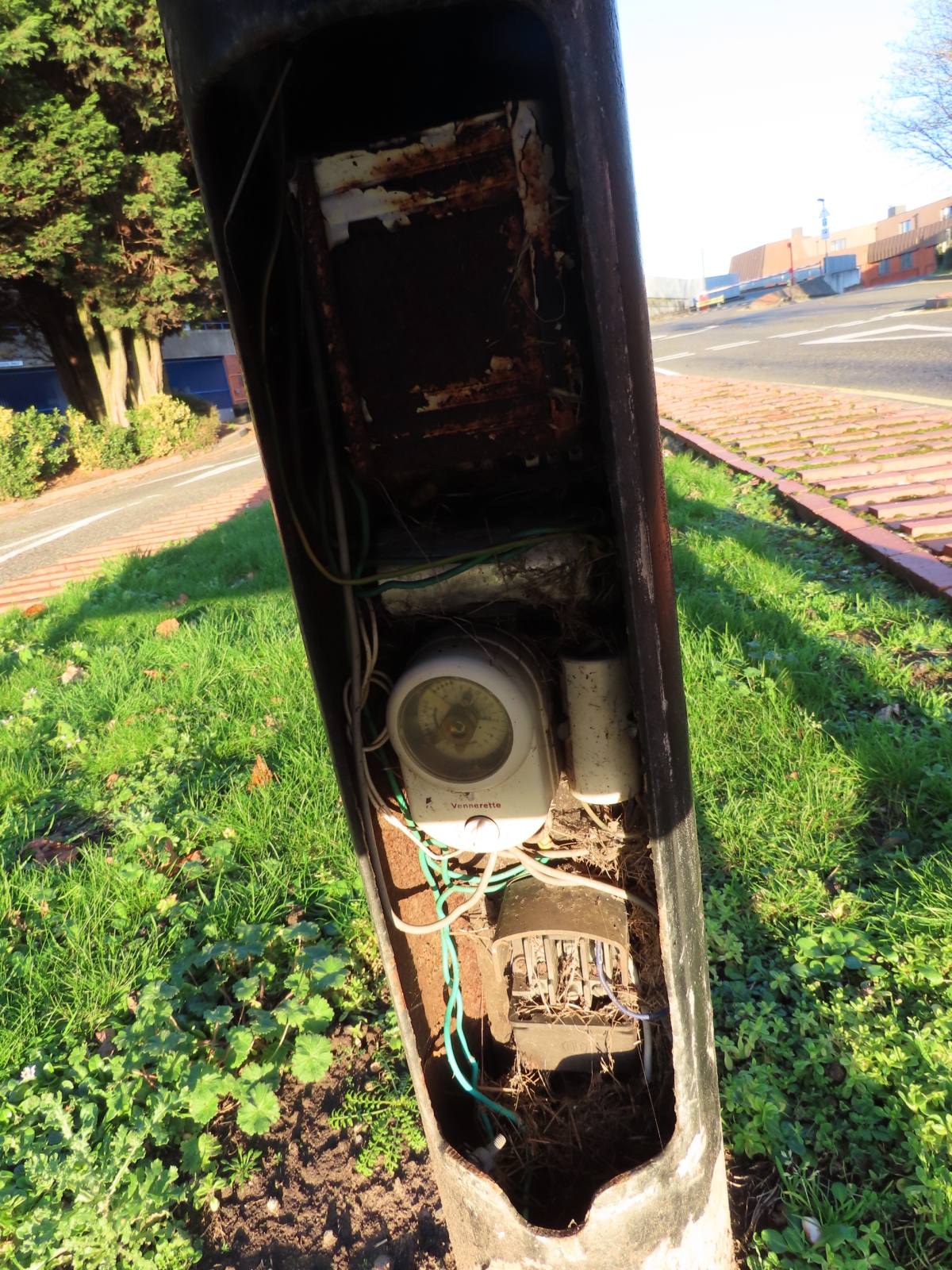 The detached door allows the innards of the column base to be glimpsed. The fuse carrier is missing from the cut-out, confirming that the installation does not work (I hope that the supply is not still live!). A Venner 'Vennerette' mechanical solar time switch would have controlled the lantern's operation; the date wheel on this showed early September, while the time indicator was positioned at 7pm (or 8pm British Summer Time, as would be the case in this month). The two additional levers on the dial also suggest that the time switch had part-night capabilities; extinguishing the lamp late in the evening, and then re-activating it (where necessary) in the early hours of the following morning. The SON ignitor is sandwiched to the right of the time switch, while the capacitor is positioned above, with the ballast installed at the top of the base.