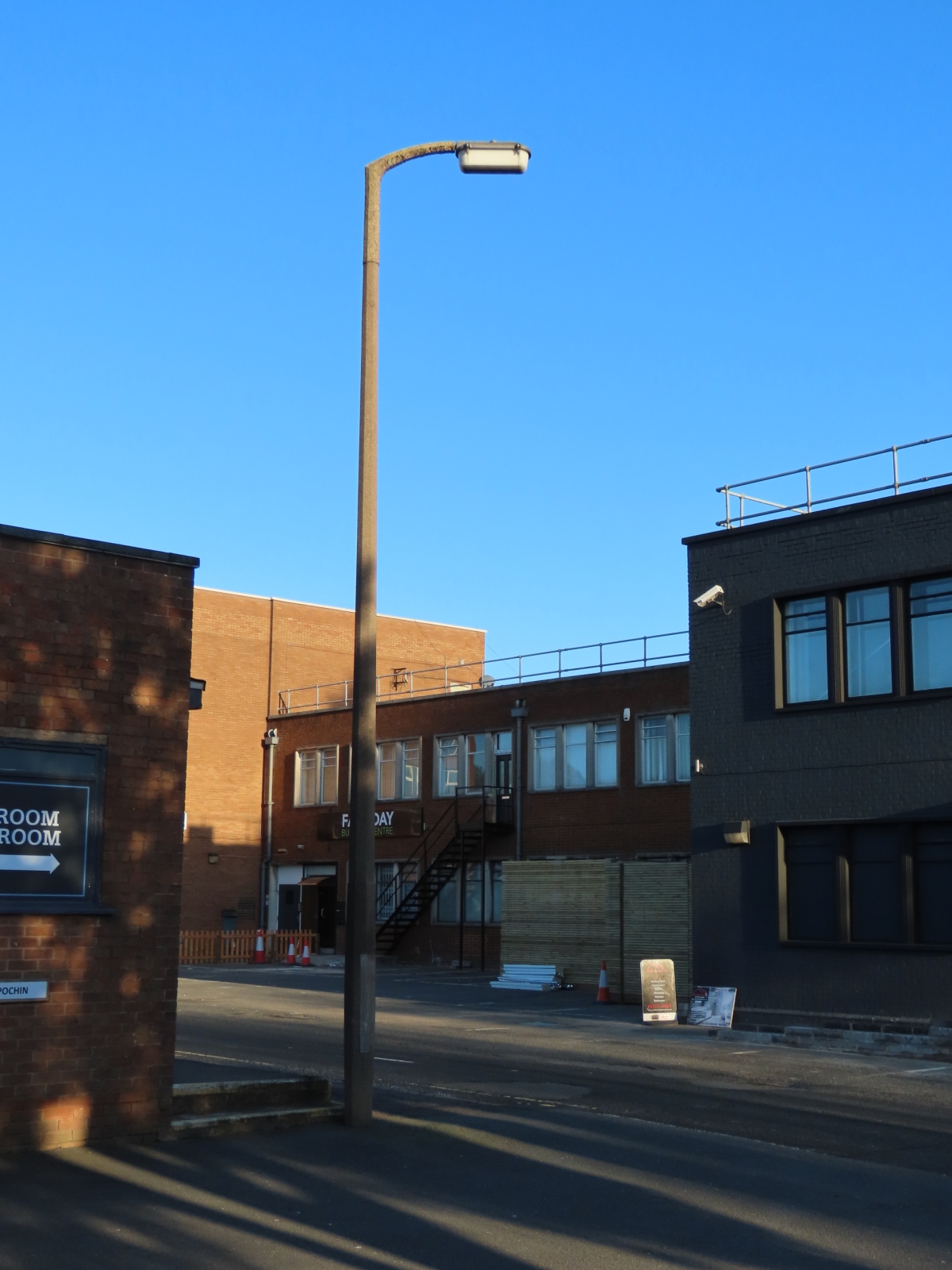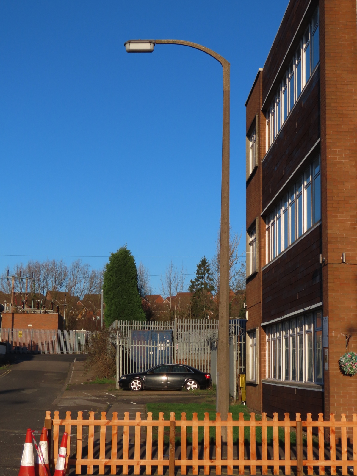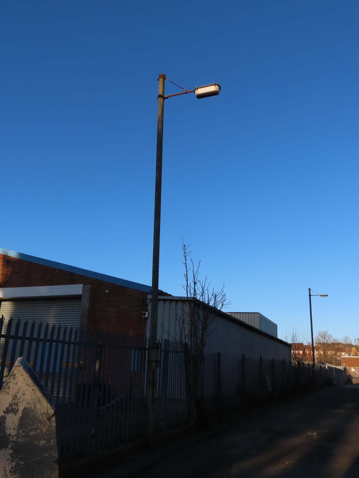 Off Windsor Road, Enfield, Redditch, Worcestershire With thanks to Leo Conway for informing me of these Survivors. Situated between some industrial buildings, which were once a depot for the Midlands Electricity Board, are several surviving 25 ft (8 m) columns, all of which support Revo C13723/S ("Dalek") lanterns, which would have run 140 Watt SO/H and SOI/H (low pressure sodium) lamps initially, but as technology improved, would have run 100 Watt (and later, 90 Watt) SOX lamps instead; these being of the same size and electrical characteristics of the older lamp types. Although only one of the lanterns shows obvious signs of damage, the likelihood of any of the other lanterns remaining in nightly service is slim at best.