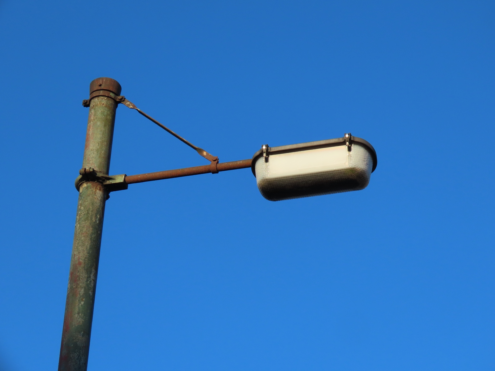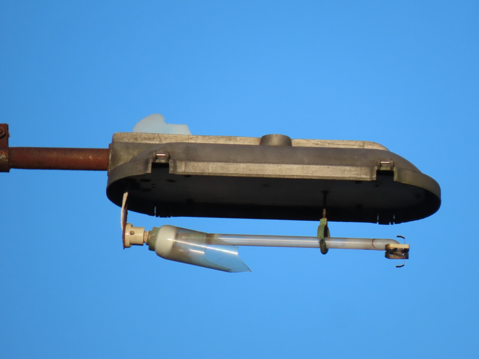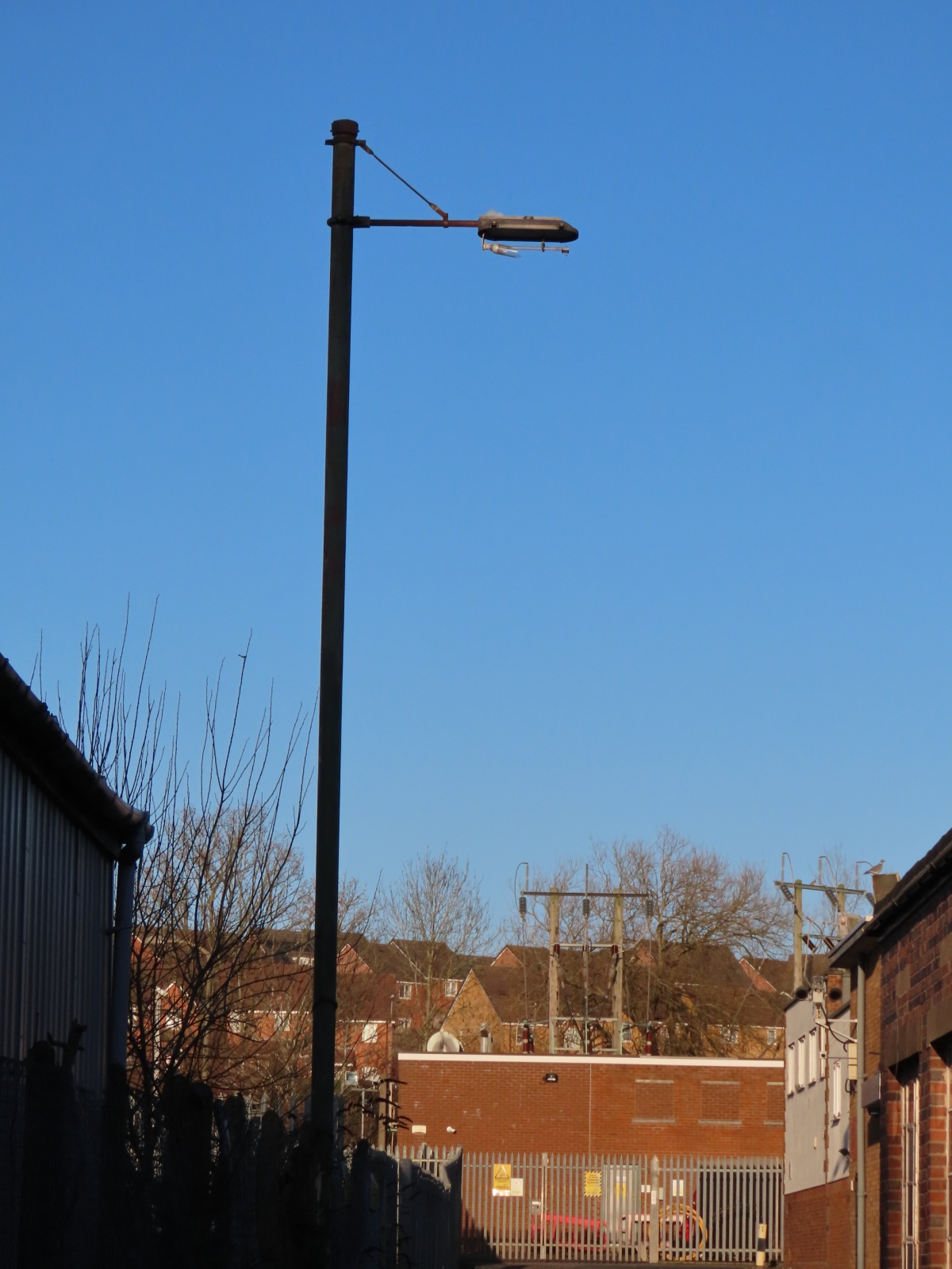 A large tree used to surround this installation, and that may have caused the delicate Perspex bowl to break - either, in windy weather, or as the tree was removed. The smashed GE SOX lamp could be the result of vandalism, however, as the lamp still appeared intact in September 2020, long after the tree had gone, but had become broken by the following August.