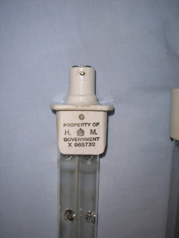 The arc tube carries a rare "Property of H.M. Government" frank in the space above the electrodes; a close-up of this is shown below: