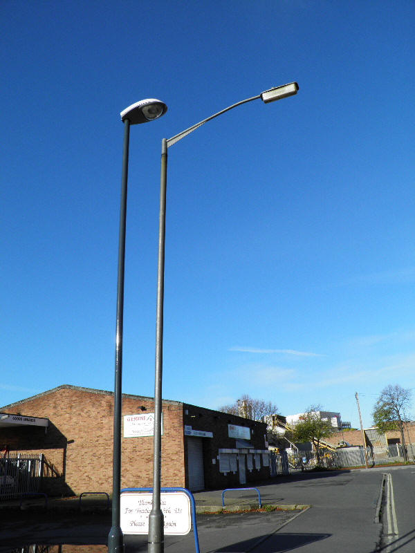 The following photographs were taken on Sunday, 24th October 2010. The two outgoing columns on this short road linking John Street with Canal Street both supported GEC Z9538 lanterns.