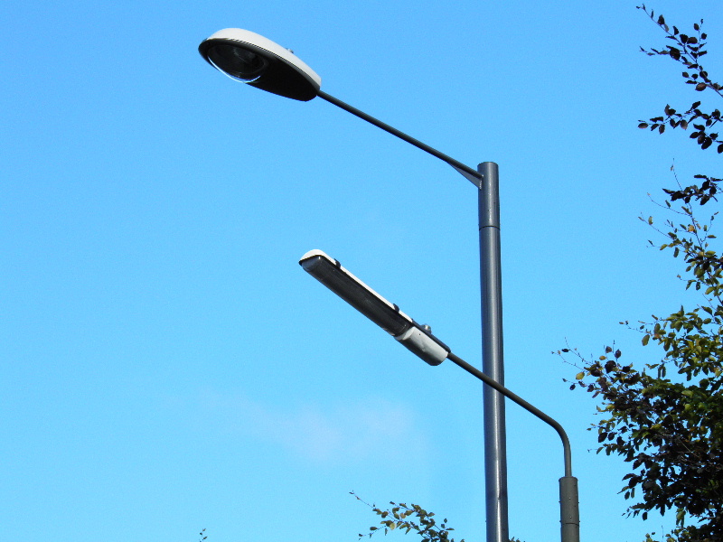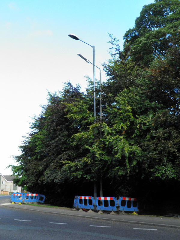 The MA 50 that was removed from its bracket before the column was taken away is visible in the following picture - it is the lantern that isn't working. The white light in the foreground is from the Cosmo-White lighting installed on Ladybank Road.