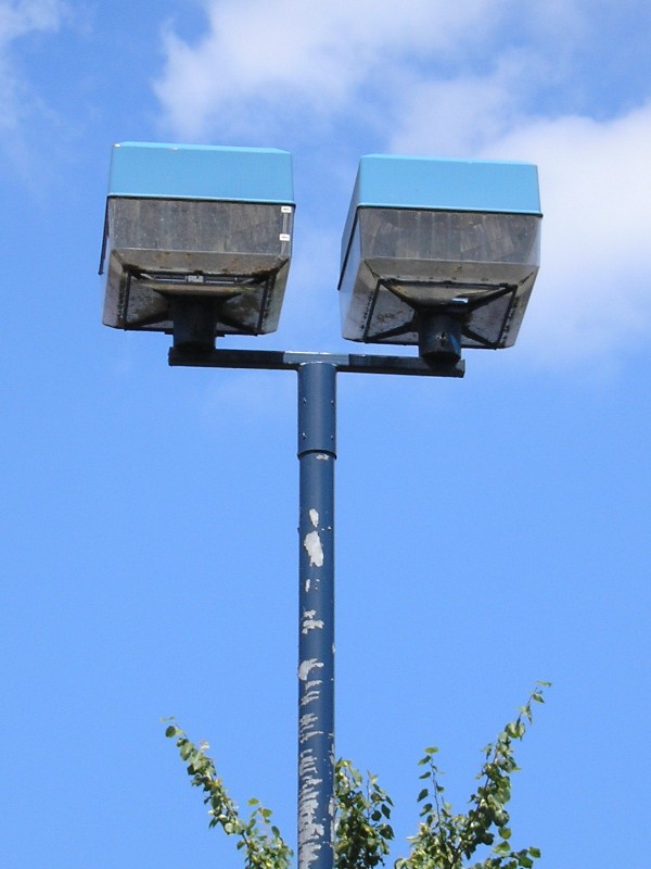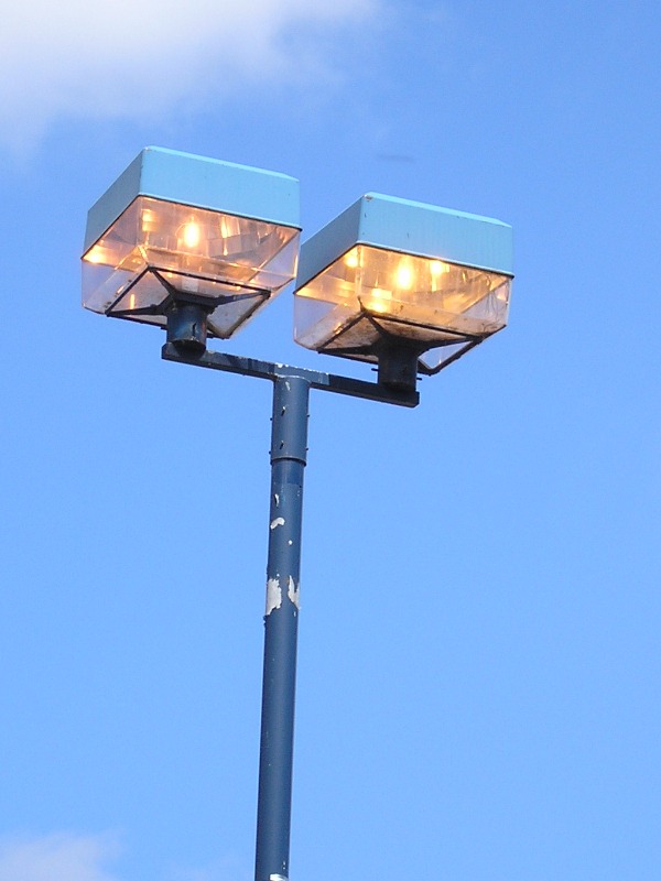 A couple of nearby examples were dayburning at the time of photographing - the fact that both lanterns were operating in daylight suggests that only one of the lanterns was fitted with a photocell control, with the other being wired as a slave unit. This does allow for the internal construction of the lanterns to be revealed, however - the central vertically-positioned lamp and surrounding facetted optic later being employed by the successor to the AM 490 - the Orion.