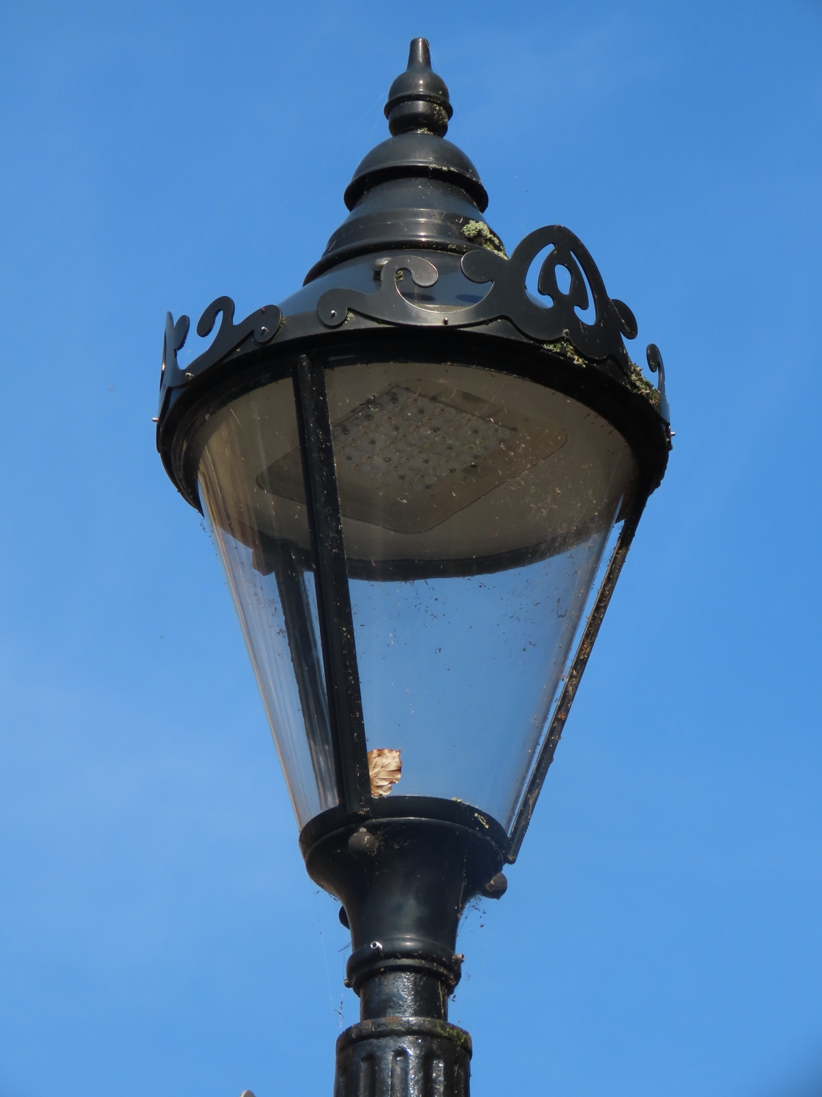 The lanterns include an internal polycarbonate prismatic refractor bowl, in order to diffuse the output from the (SON) lamps. A single green flag from a bunting string can be seen attached to this lantern's canopy.