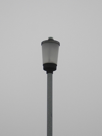 The paint finish on this all-night example's canopy is in better condition; ironically, this is likely to be an older lantern than the two above examples are. Notice the slightly more unusual post-top sleeve fitted to the Stanton 10F concrete column.