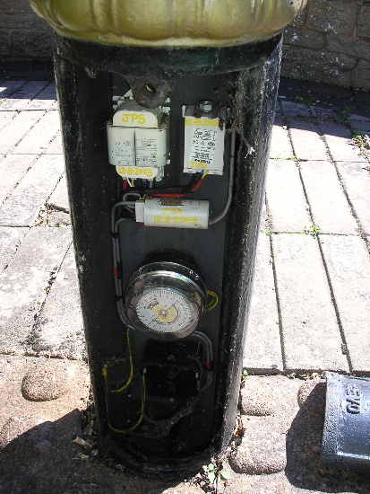 This example features the more common solid base section. Again, a minicell is fitted to the canopy; however, the housing for a Royce Thompson P9 column-mounted photocell (badly fitted with a P10 unit) is also present, suggesting that a lantern replacement has occurred.