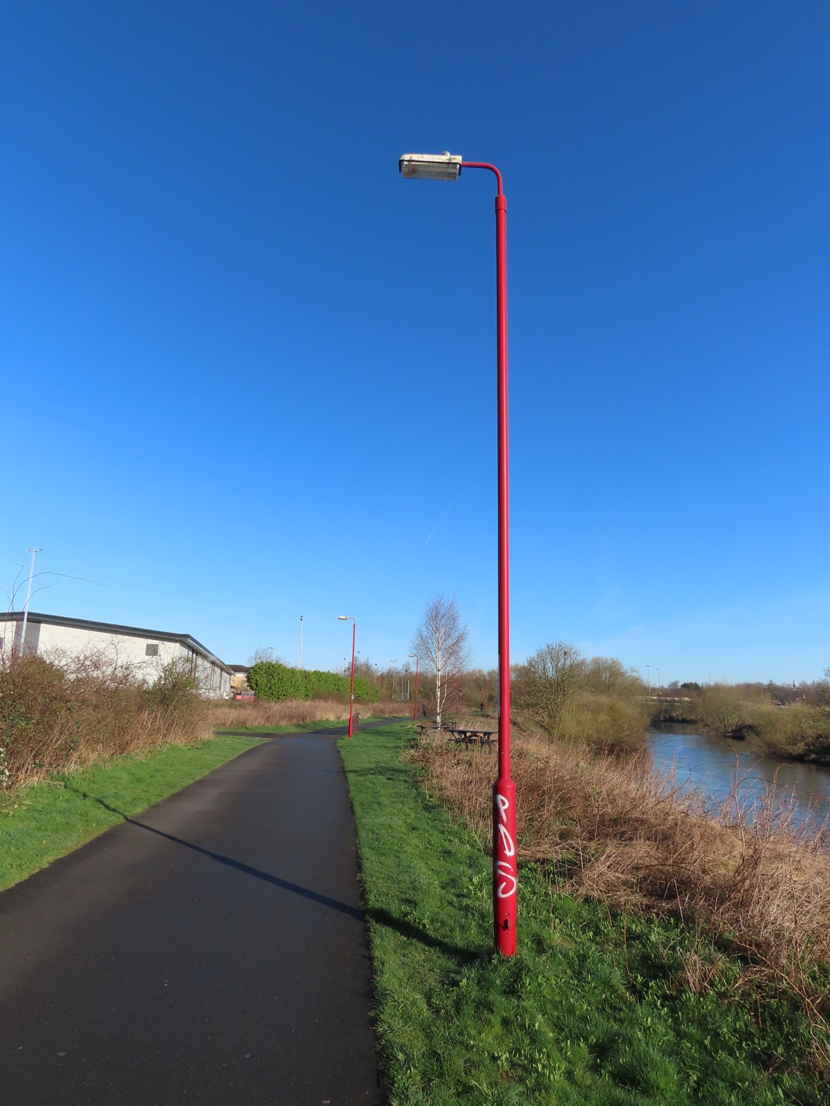 The section of footpath south of Derwent Parade on Derby's Pride Park, and adjacent the River Derwent, was home to a number of base-hinged Fabrikat 6 m tubular steel columns supporting MI 36s, and painted the standard bright red colour that all of the street furniture is painted in this area. Indeed, my own Thorn Triumph 1 originates from another section of the footpath, and is painted to match the column. The MI 36 canopies are in their usual unpainted finish, however.