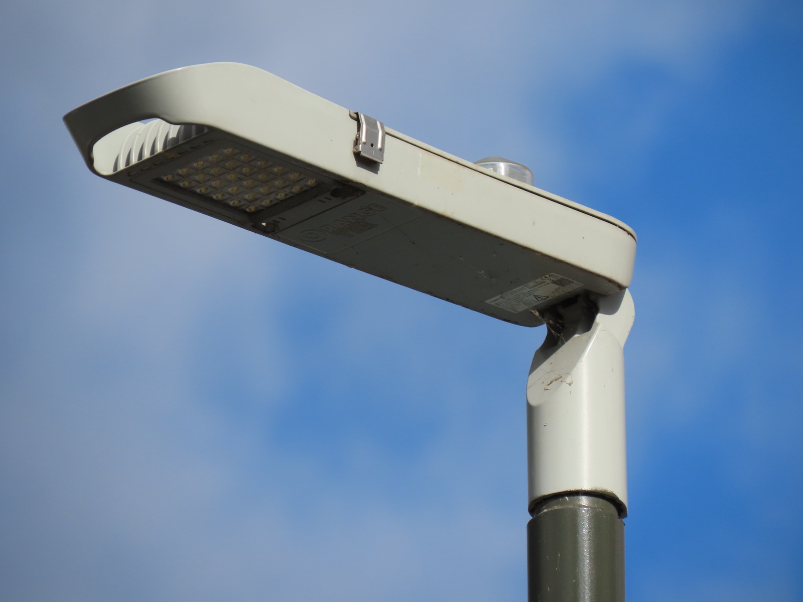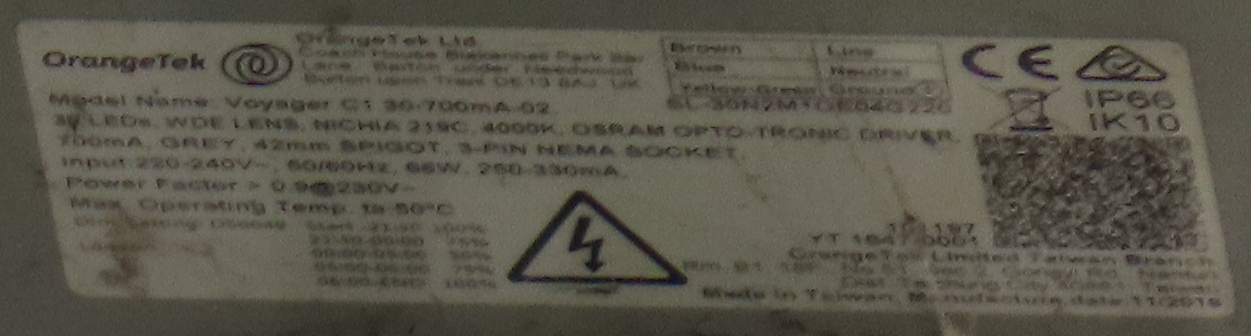 This close-up of the label tells us all that we would ever wish to know about the lantern - in operation, the 4000 K LEDs are driven at 300 mA, with a total power consumption of 13 Watt; however, there is a dimming regime incorporated into the LED driver - the lantern runs at 100% operation from dusk until 21:30. From then until midnight, the output is reduced to 75% operation. Between midnight and 05:00, the output reduces again; this time, to 50%. The output increases back to 75% from then until 06:00. Finally, full brightness is returned after 06:00 until dawn. The Time Zone is described as "London", although, there is no mention of whether this is GMT, BST or both. The beam distribution on this example is described as 'MDE' - for roads of a 'medium' width. Meanwhile, the address for the company is given as the 5th Floor of 192 Dadun Road, in the Nantun District of Taichung City, Taiwan...or here, in other words! A far cry from the very rural Staffordshire base for OrangeTEK's UK office. Curiously, while the uppermost label states a manufacture date of March 2017, the lower label suggests a manufacture date of December 2016 instead. The close-up image also reveals that the lantern is set to a tilt of five degrees above the horizontal.