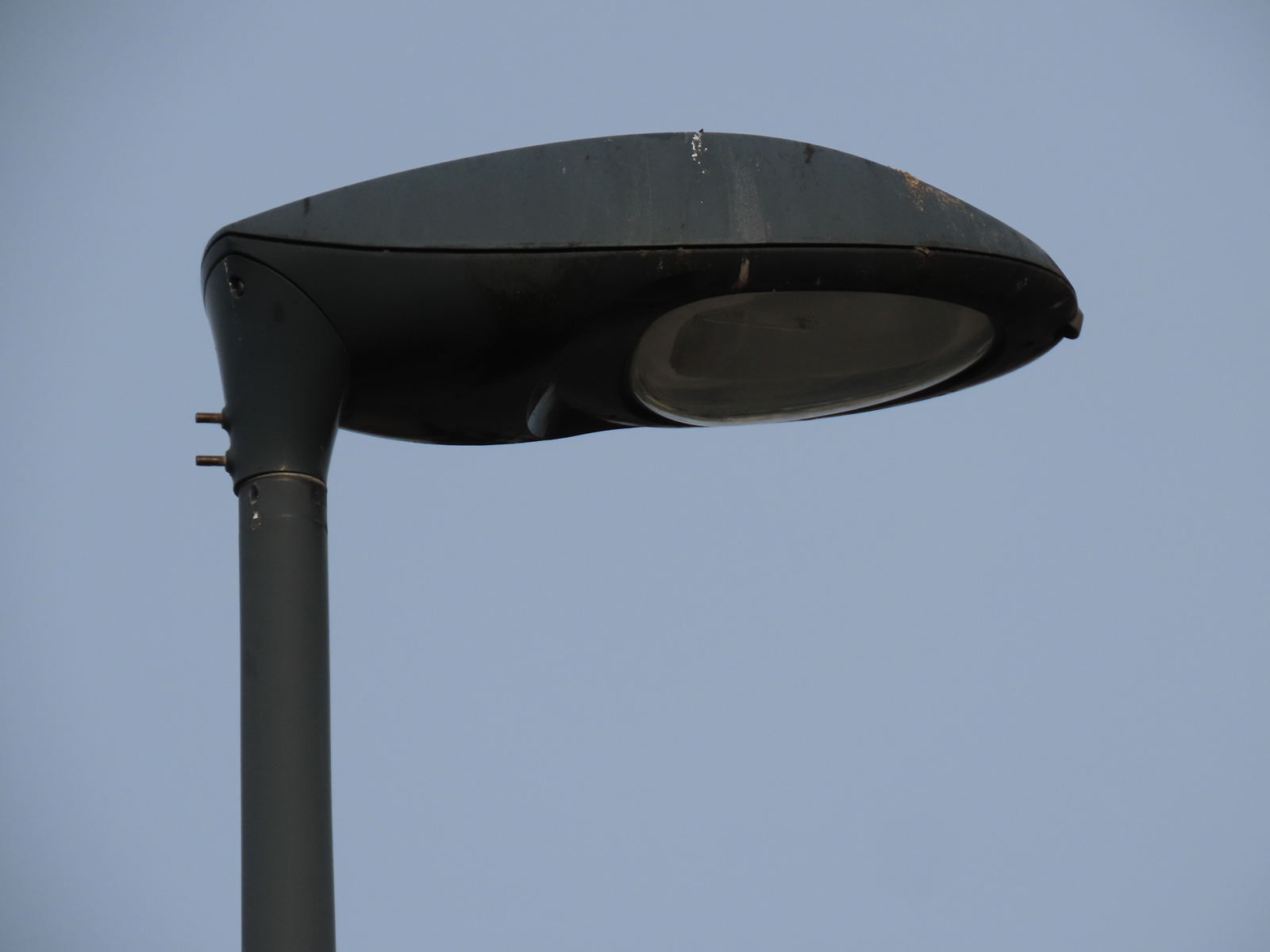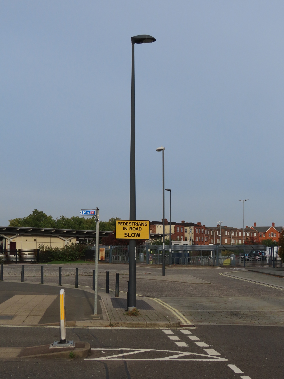 The lantern fitted to the column that is positioned behind the station has a rear shield fitted; presumably, to reduce glare to train drivers, rather than having the potential for the light output to cause potential confusion over a signal aspect colour, as SOX (low pressure sodium) lanterns might.