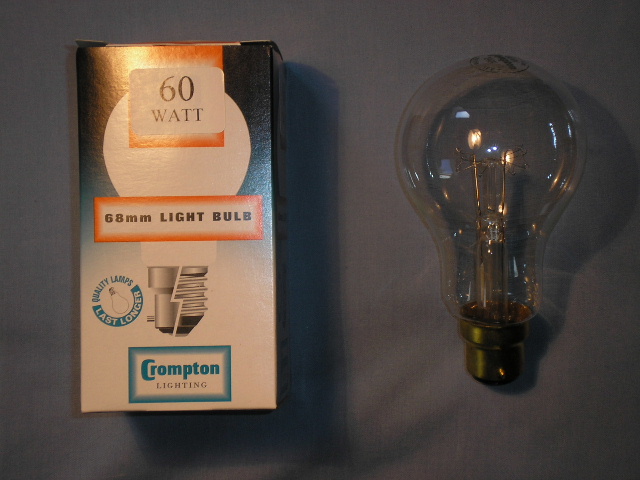 "In 1997 I approached Crompton about having an 80 mm bulb Permalife made , a Permalife Derby 100 if you like. They couldn't do the big 80 mm bulbs anymore by then, but they offered a 68 mm bulb, still used on crown silvers, 150 Watt lamps and various rough service bulbs. I dealt with a very helpful chap called John Walton and they did me 50 x 60 Watt lamps in a 68 mm bulb. I visited the factory at Guiseley ( now closed down - Crompton make very few lamps themselves anymore ) and saw them being made."