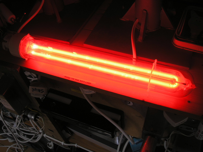 Given that the arc tube of this lamp looked new and unused, I decided to see whether it would work if power was applied. Using a 90 Watt SOX transformer, I connected up and the circuit and switched on. Thankfully, the lamp fired up immediately. The starting colour was a far deeper red than the starting colour of SOX lamps is - the lamp, at this stage, therefore resembled an uncoated neon lamp.