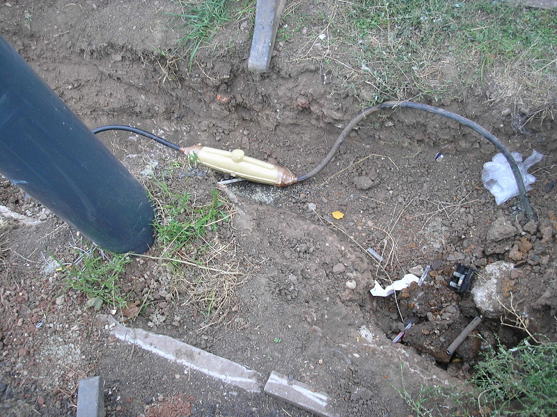 The existing supply cable was largely re-used, although new lengths of cable were jointed on to the existing lengths in order for them to reach the bases of the new columns. The photograph below shows such an occurrence. The outgoing column had already been removed from this location; hence the presence of a discarded fuse carrier in the excavation.