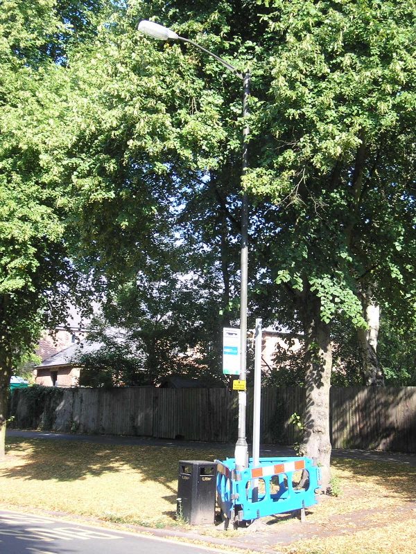 The outgoing column doubled up as a bus stop. Owing to there not being a new column installed here, a short straight post was installed, in order to support the bus stop sign.