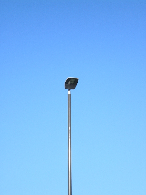 New 10 m columns supporting these modern-looking lanterns were installed on the road as part of a new housing development in late 2015; these pictures were taken in February 2016.