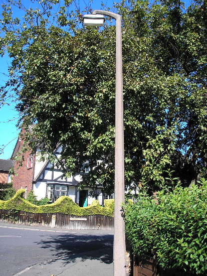 This is the more modern equivalent - there were many streets in Derby with identical installations to this, prior to the commencement of the PFI. I am not sure if the side-entry brackets have always had these top-entry converter sections fitted, or if side-entry lanterns were fitted at one time. If this was the case, the lantern choice would almost certainly have been a small mercury lantern.