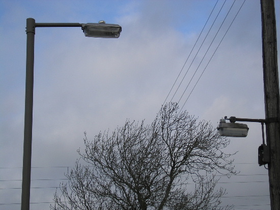 Old meets new here! This unusual setup can be seen in Findern and is due to road realignment in the mid-1990s as a result of the A50 Southern Derby bypass being constructed. What was previously part of Heath Lane is now a public footpath, lit with side-entry Beta 5s on Abacus drop-down columns. The original 'road' lanterns, top-entry Beta 5s mounted to wooden Electricity Company poles, still survive, although they have long since been disconnected.