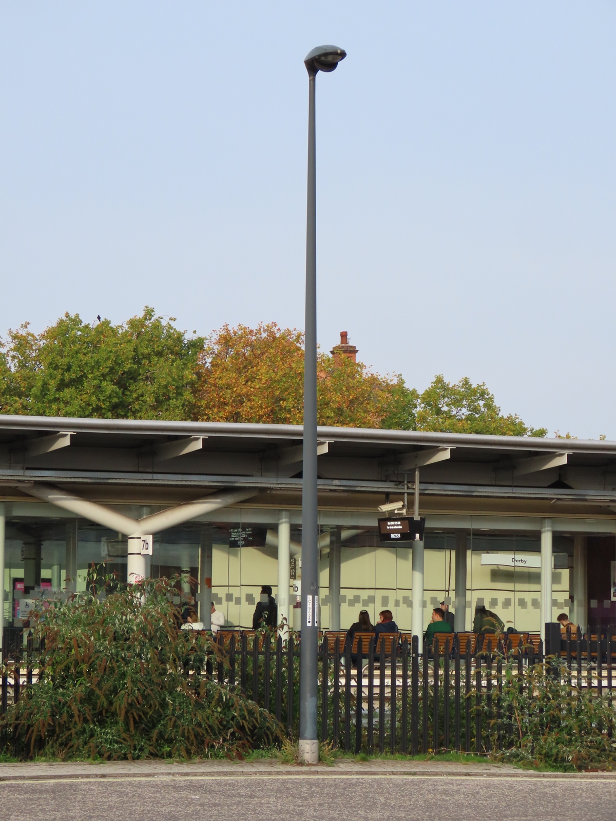 The smaller Modenas are attached post-top to tapering columns that surround a small roundabout at the end of road. Derby's railway station is visible in the background.
