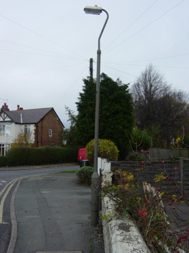 Originally, a small lantern running a mercury vapour lamp; for example, a GEC Z8896 would have been fitted. Judging by how the dirt has accumulated on this lantern, the column appears to have been off-vertical for years.