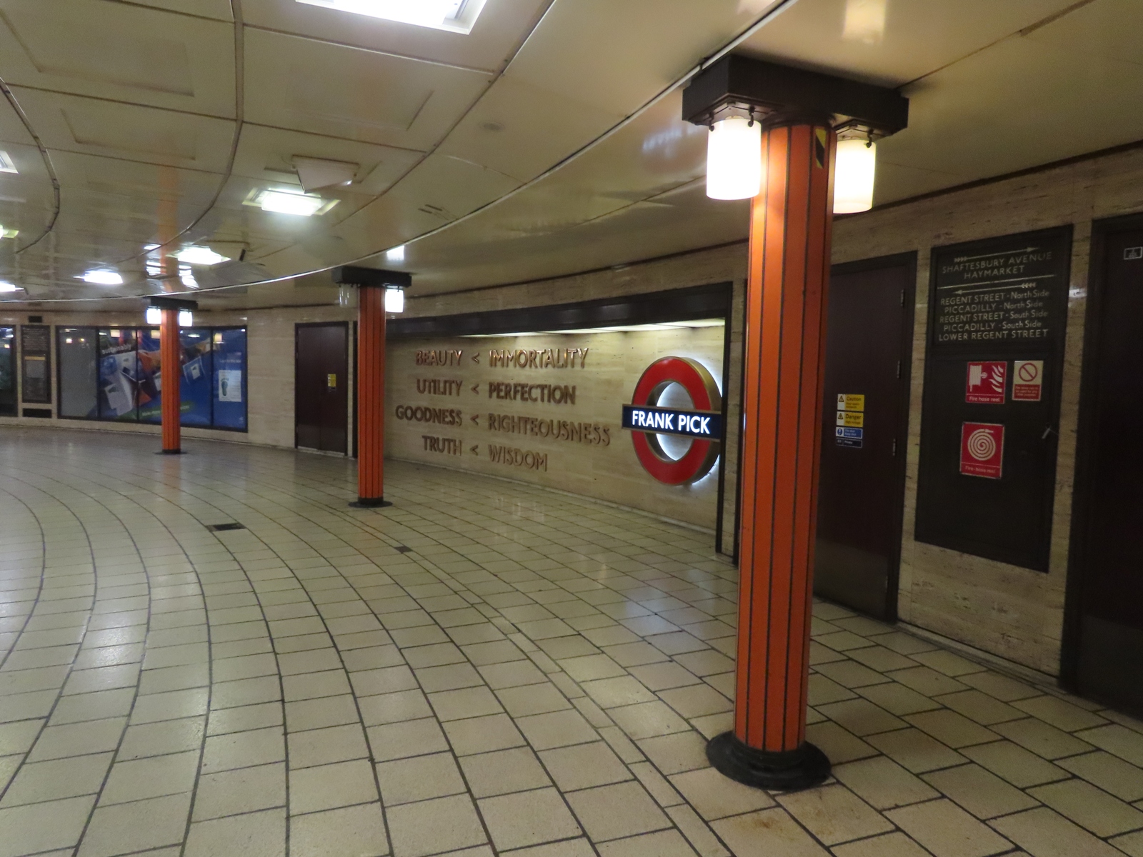 Holden’s design comprised a circular space with lavish decoration that could be accessed from several staircases around the Circus. An area that once was home to a bank of pay telephones now serves as a permanent memorial to former Managing Director Frank Pick (1878 - 1941) who oversaw the introduction of many of the corporate design cues and standards that are still synonymous with the Underground to this day, as well as overseeing the extensions to many existing lines that would include further station designs by Holden. The orange colouring to the columns that support the roof is a 1970s’ alteration.