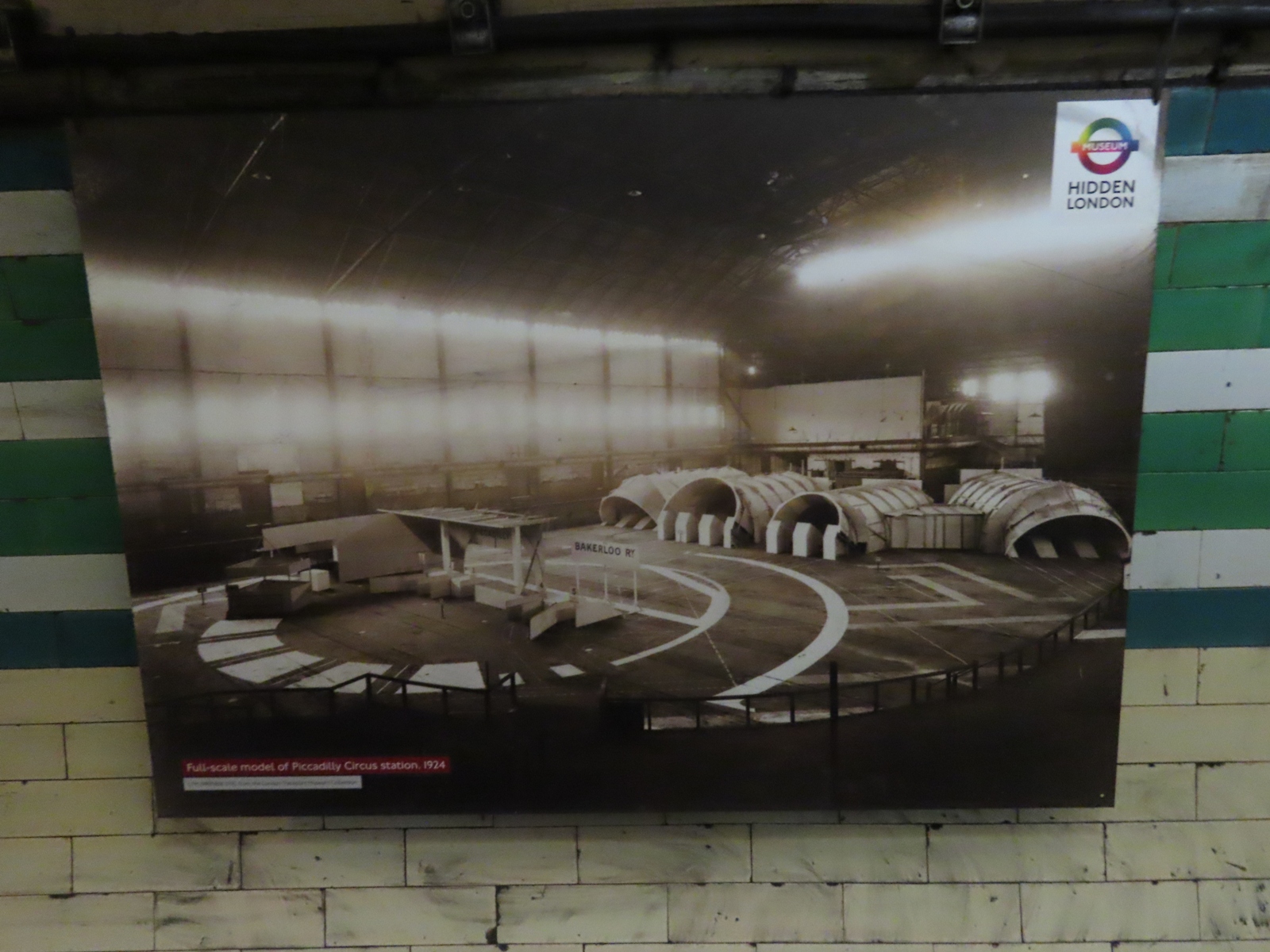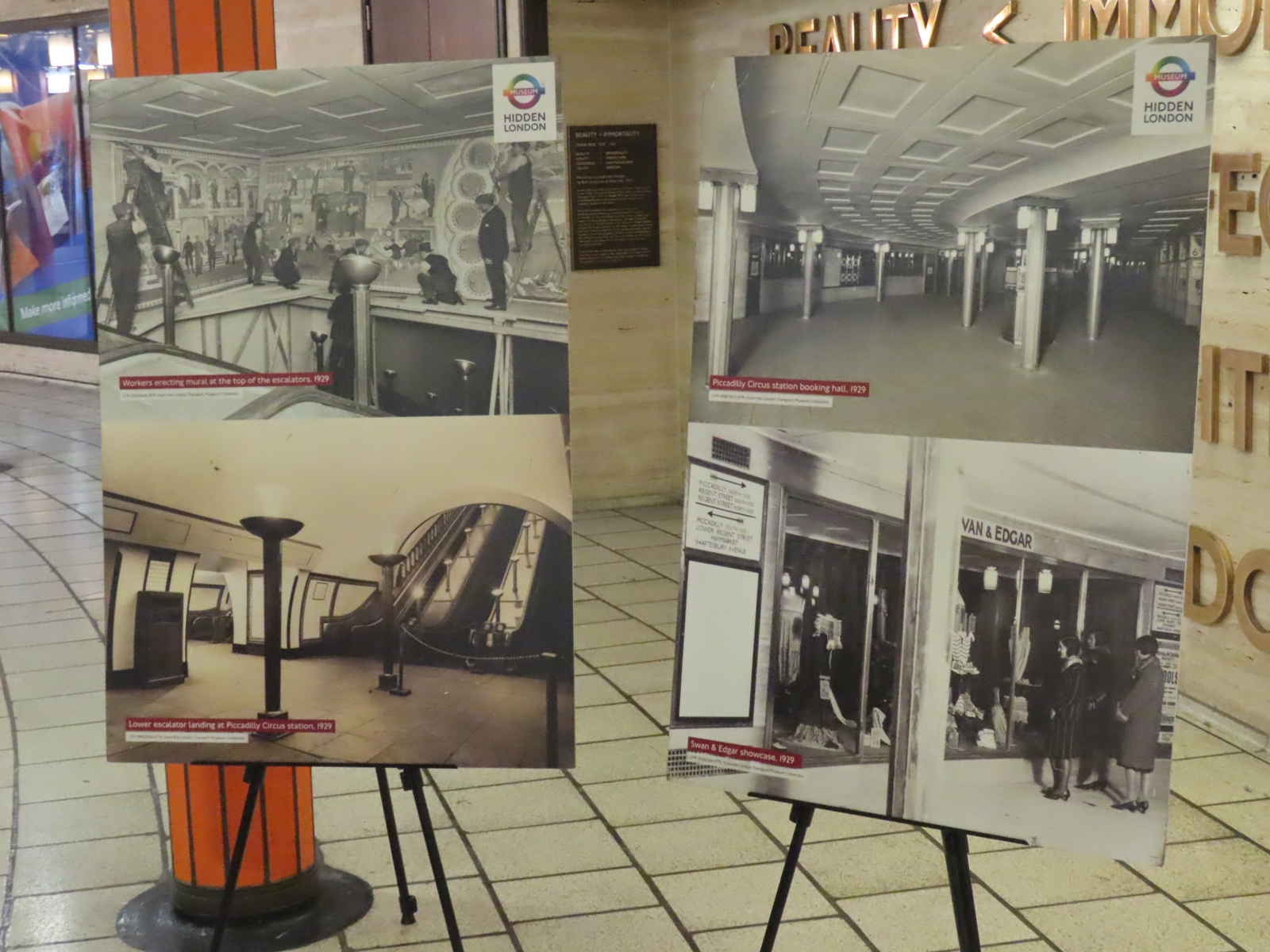 Two further panels showed pictures of the station soon after opening, including one of a mural produced by artist Stephen Bone that existed above the escalators. The mural was short-lived, with the space proving ideal, and far more lucrative, for displaying large advertisements instead - a purpose it continues to serve to this day.