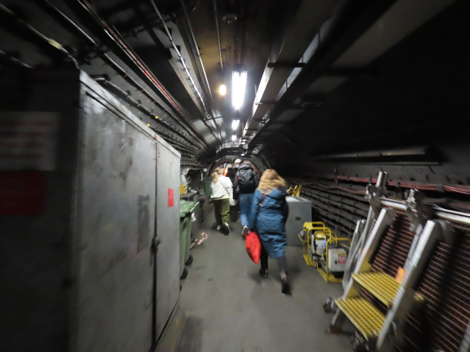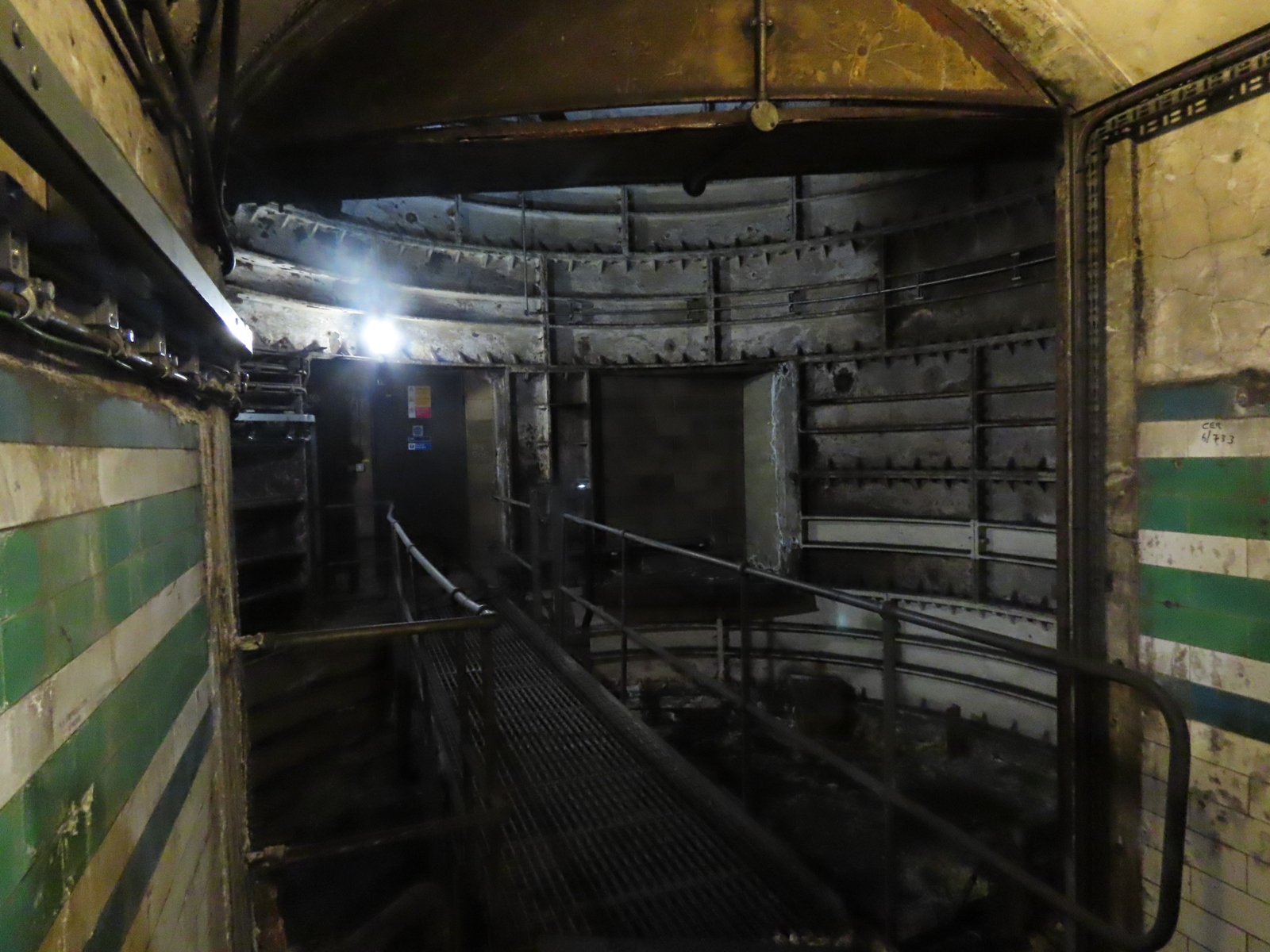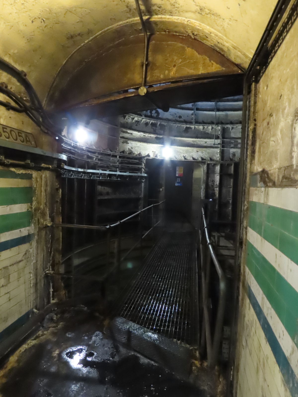The paint only extended to the section of the passageway that would be visible to any passengers peering through the grilles, however - after turning a corner, the tiling returned to being unpainted.