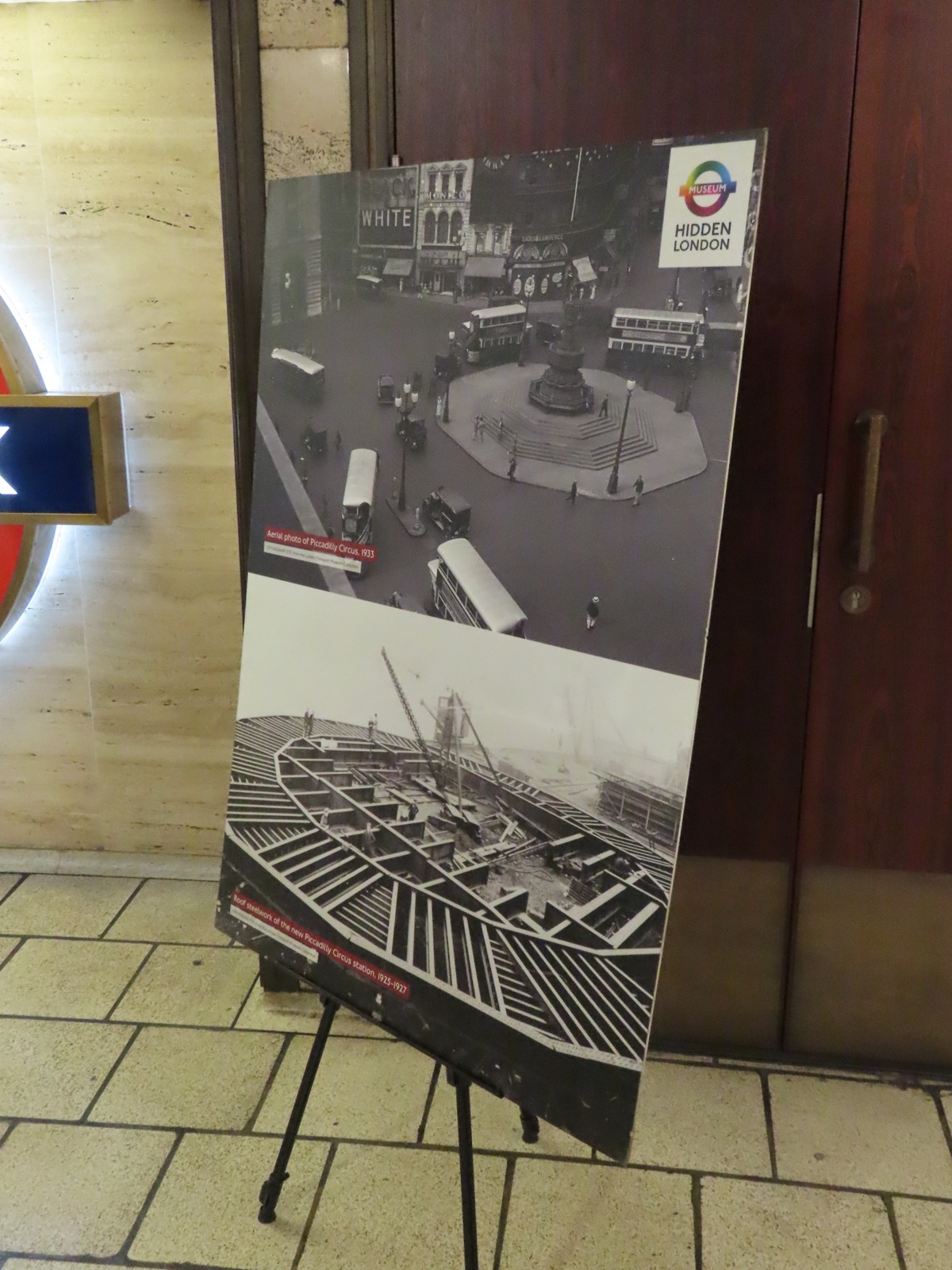 This information panel shows the Circus after the new booking hall was constructed (top), as it appeared in 1933, as well as a mid-1920s’ view of the steel roof of the booking hall (bottom).