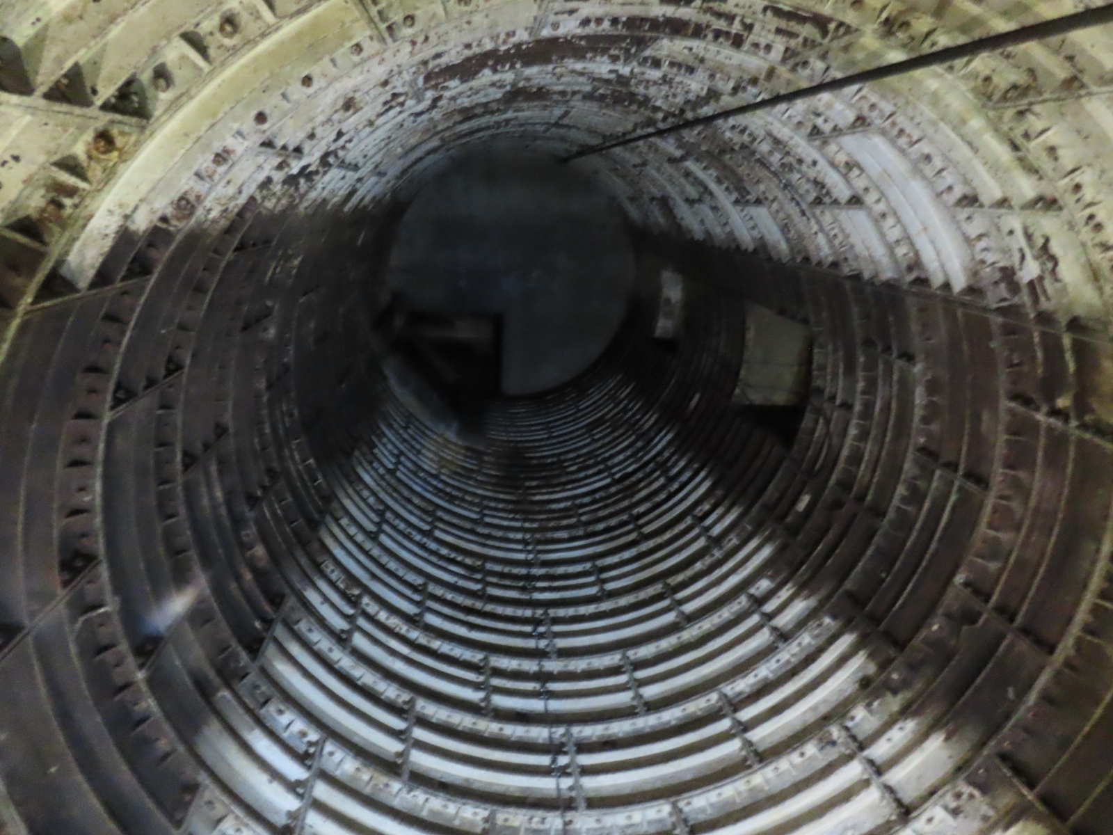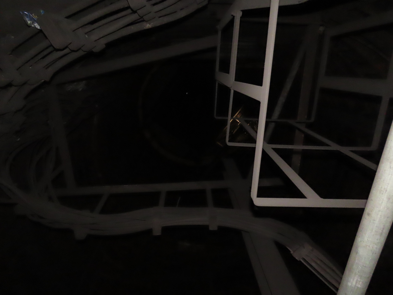 Very little could be seen when looking up into the former emergency spiral staircase shaft.