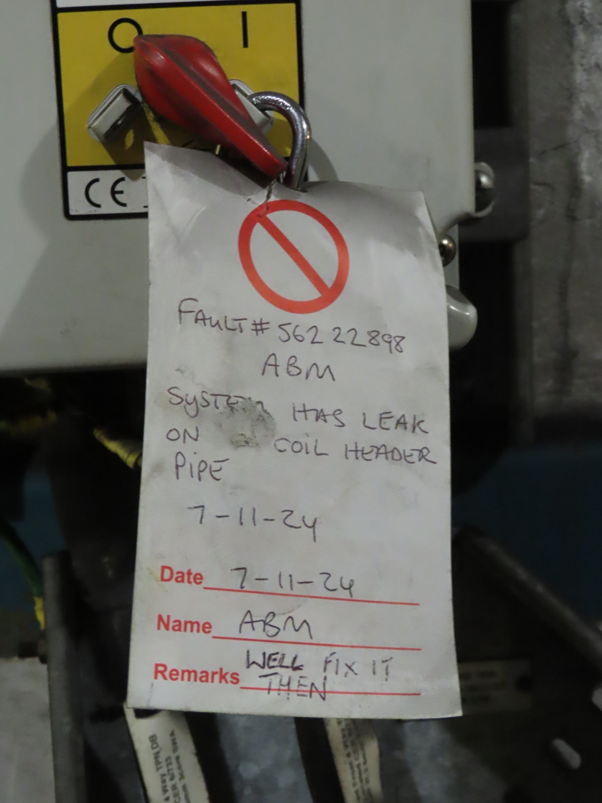 Some modern switchgear nearby had been turned off, owing to a fault on the system that it operated. A rather humorous remedial solution was included on the deactivation tag...