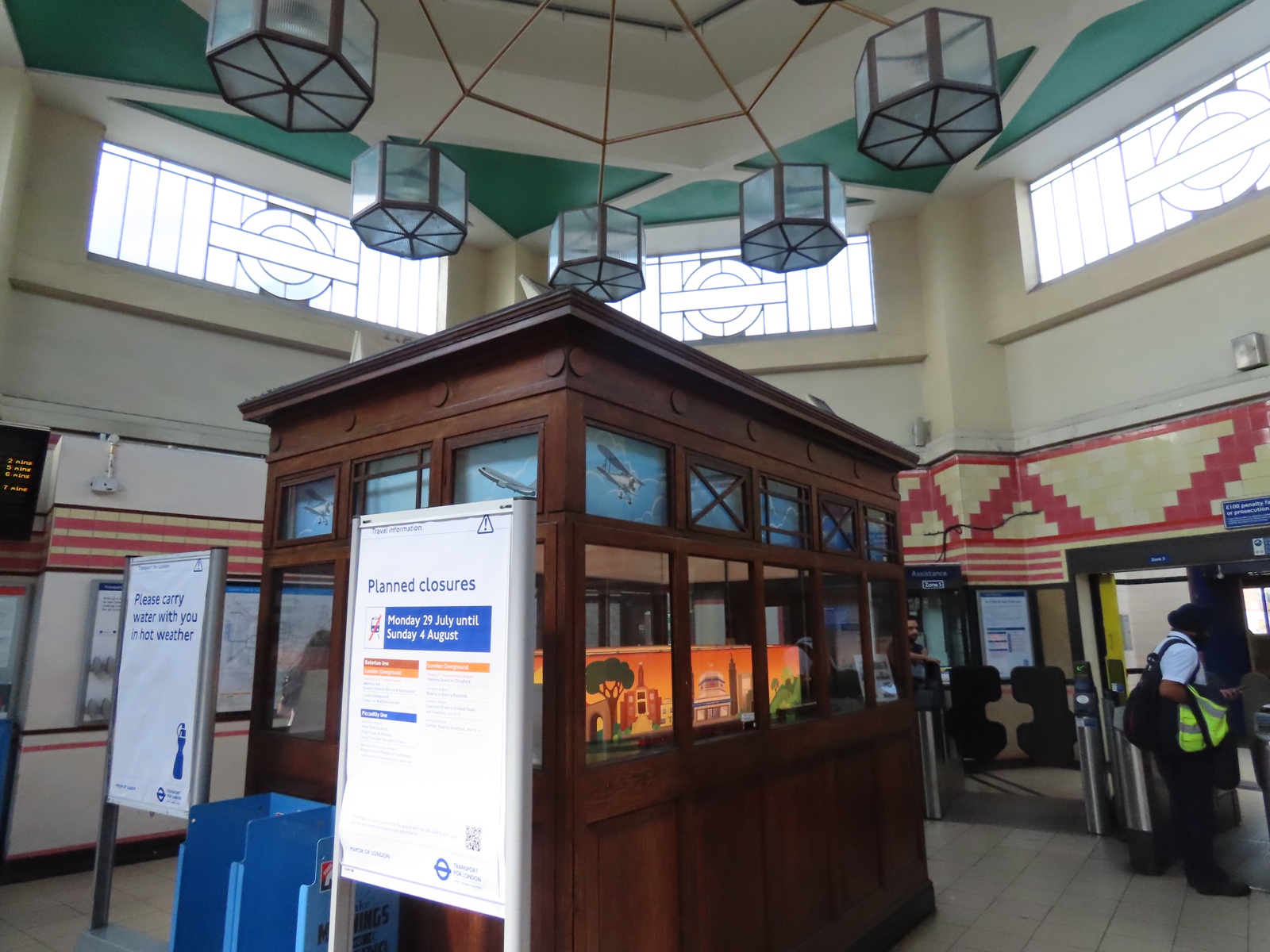 The interior of Charles Holden’s delightful 1931 booking hall at Hounslow West, complete with its original Passimeter ticket booth, is seen in August 2024.